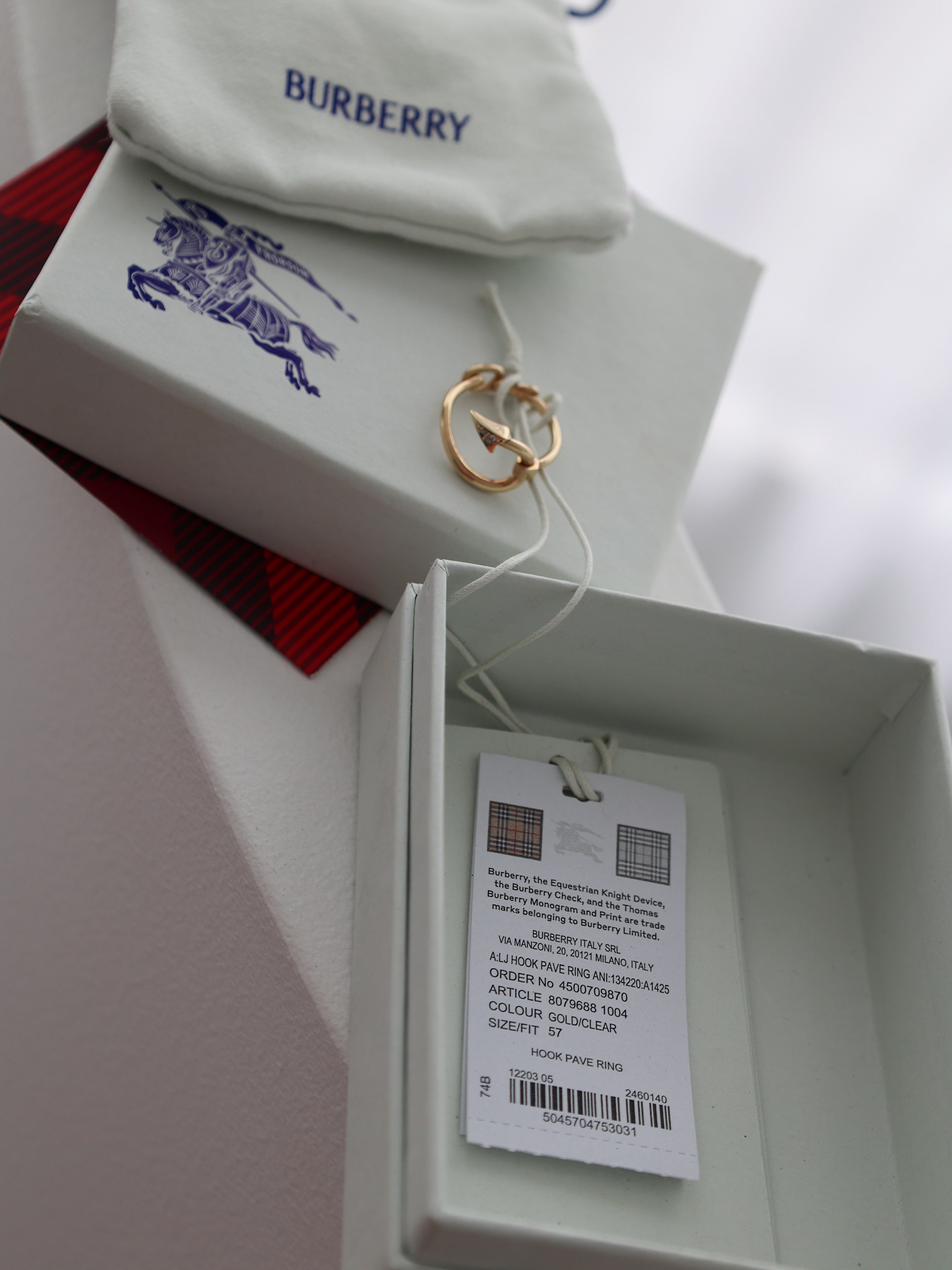 The sculptural open silhouette reflects Burberry’s modern design language, offering a minimalist yet elevated accent suitable for everyday wear or layering with other fine jewellery. The inner surface is engraved with the logo lettering.
