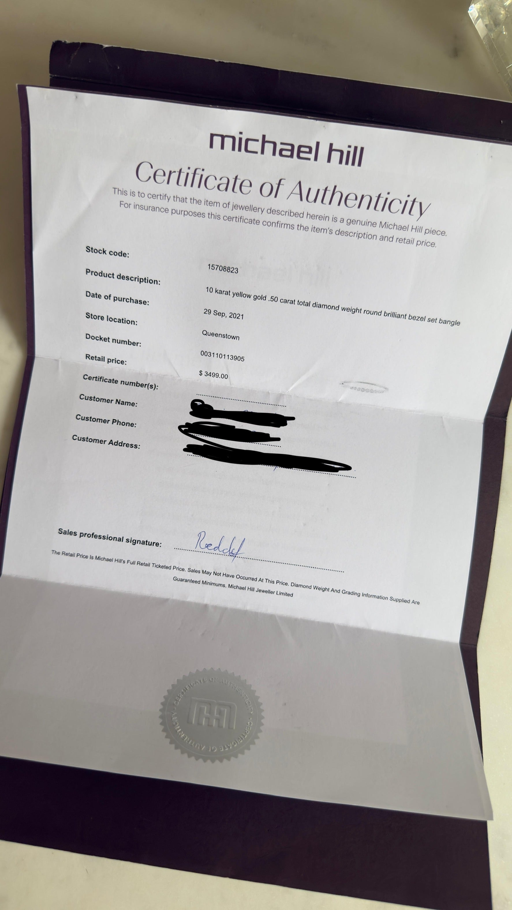 RRP: The original retail price for this Michael Hill 10K gold diamond bezel-set bangle was AU$3,499, as confirmed by the included certificate of authenticity dated September 2021.