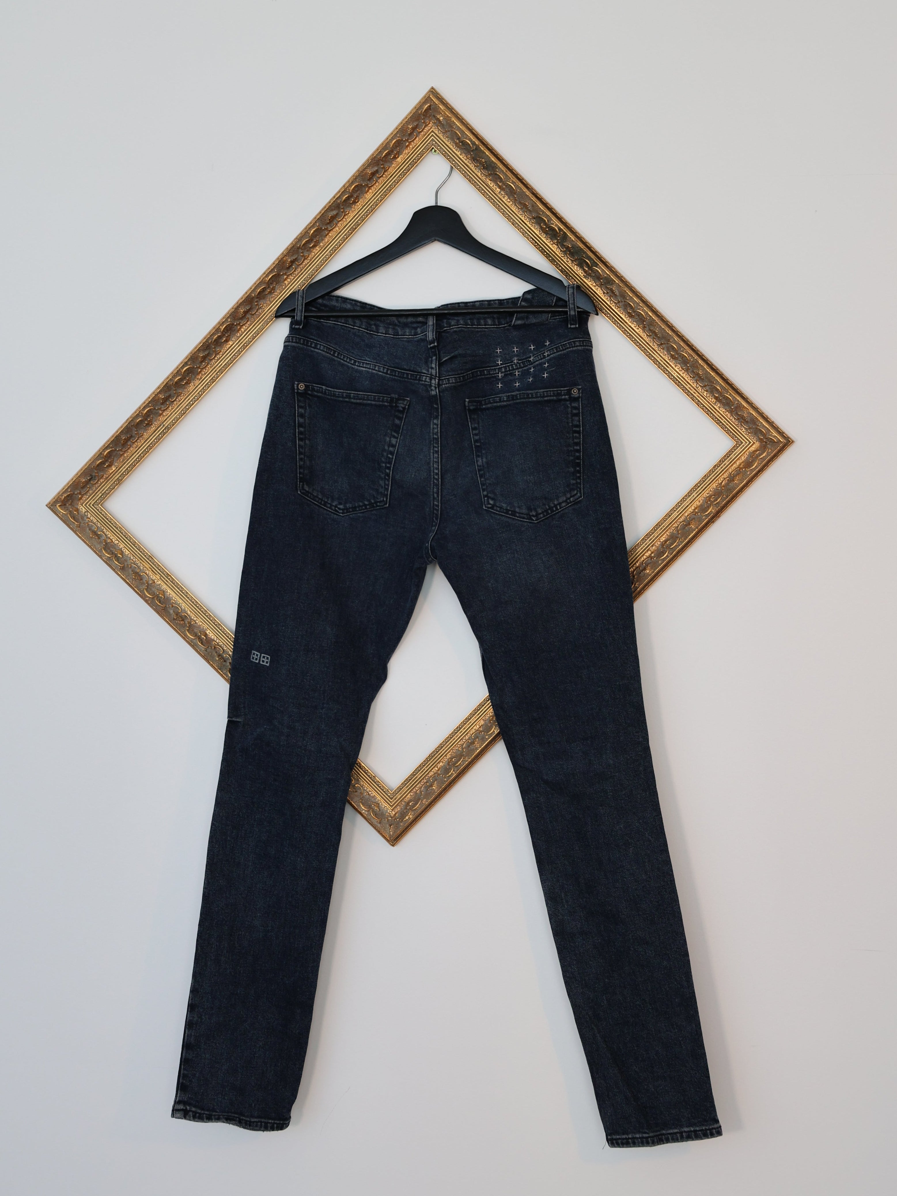 A signature pair of men’s denim jeans from Ksubi, crafted in black denim and finished with the brand’s iconic cross embroidery at the back.