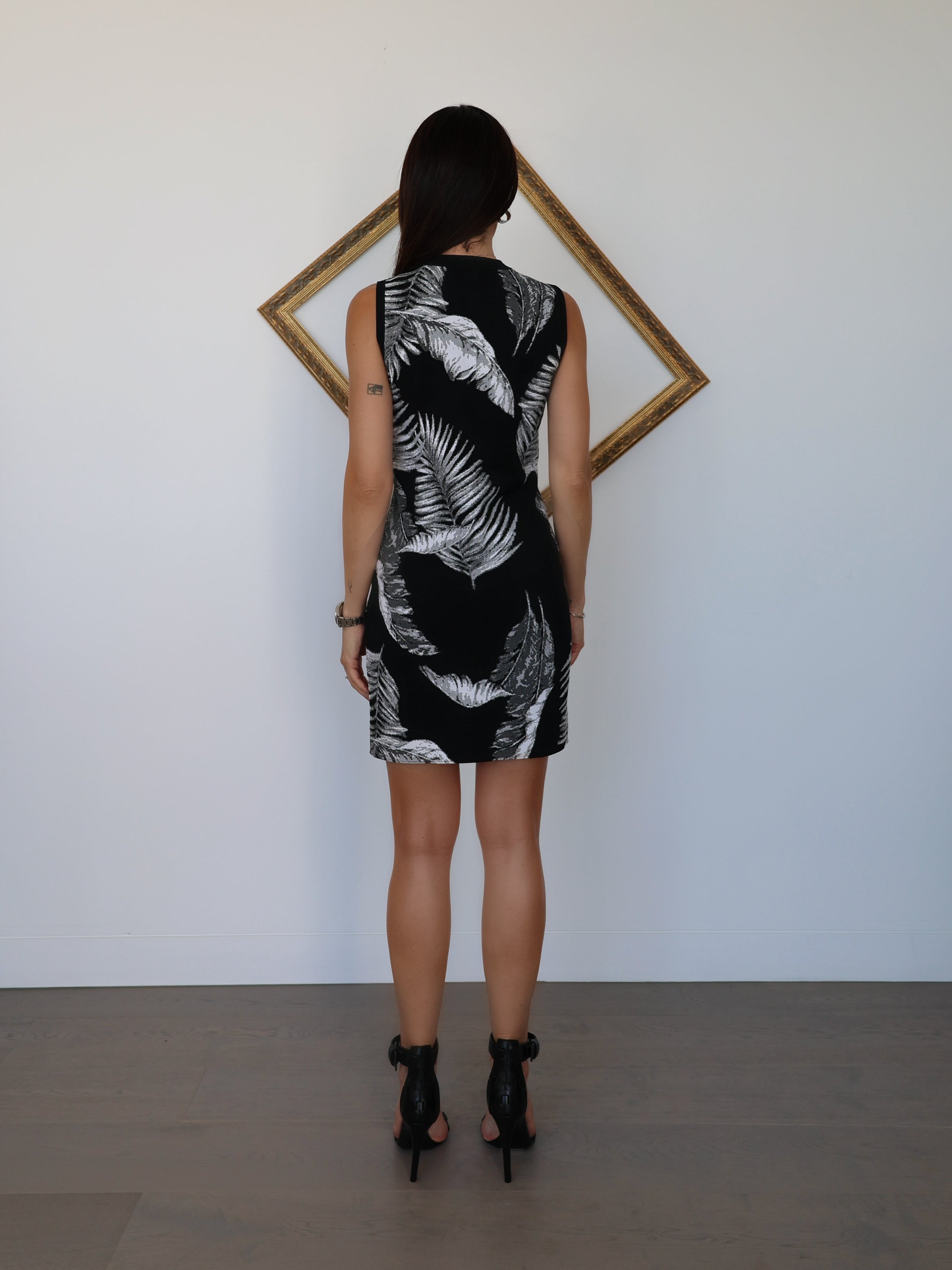 A striking and contemporary piece from Alexander Wang, this sleeveless bodycon dress features a distinctive Hawaiian-inspired jacquard pattern woven into a sleek black base.