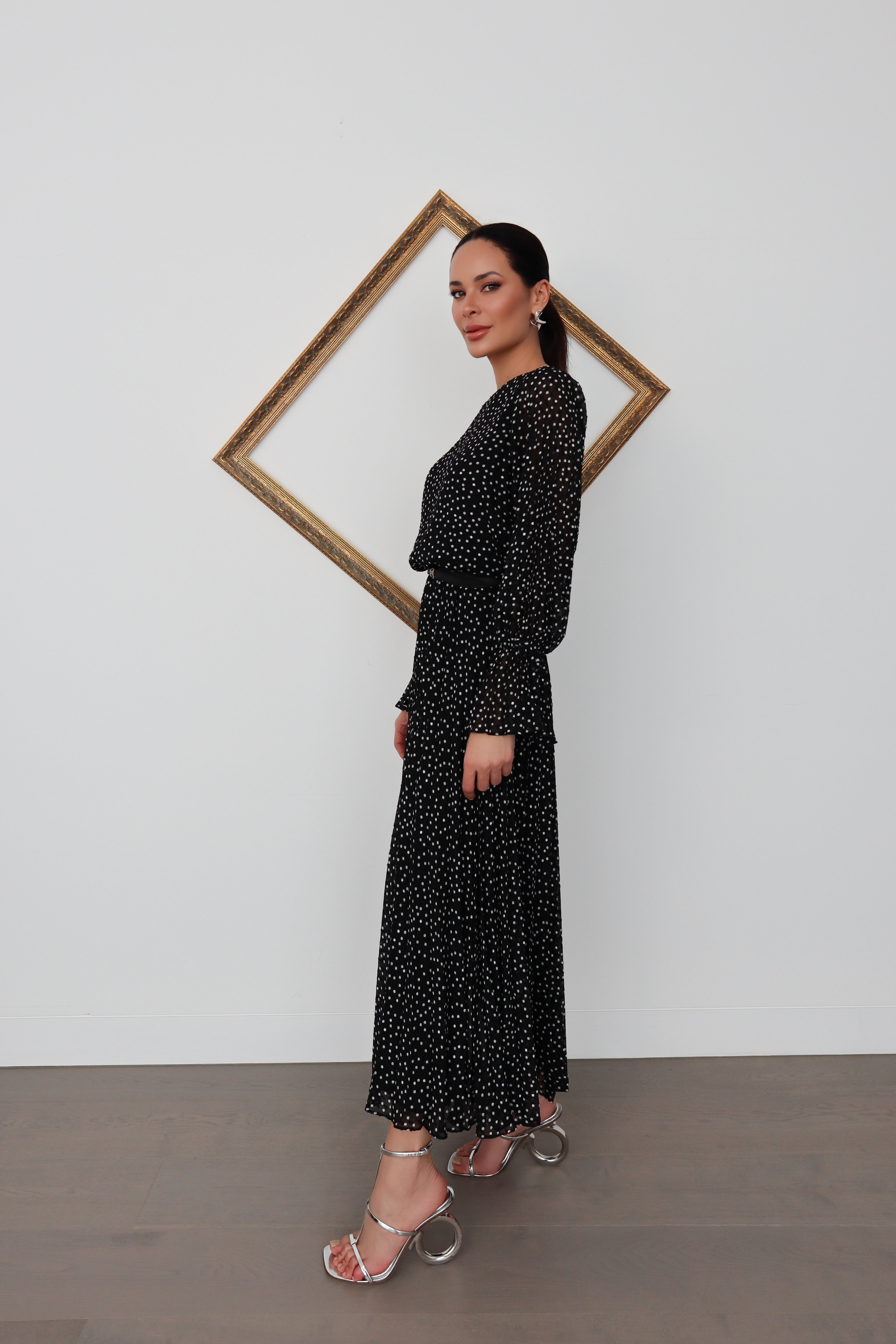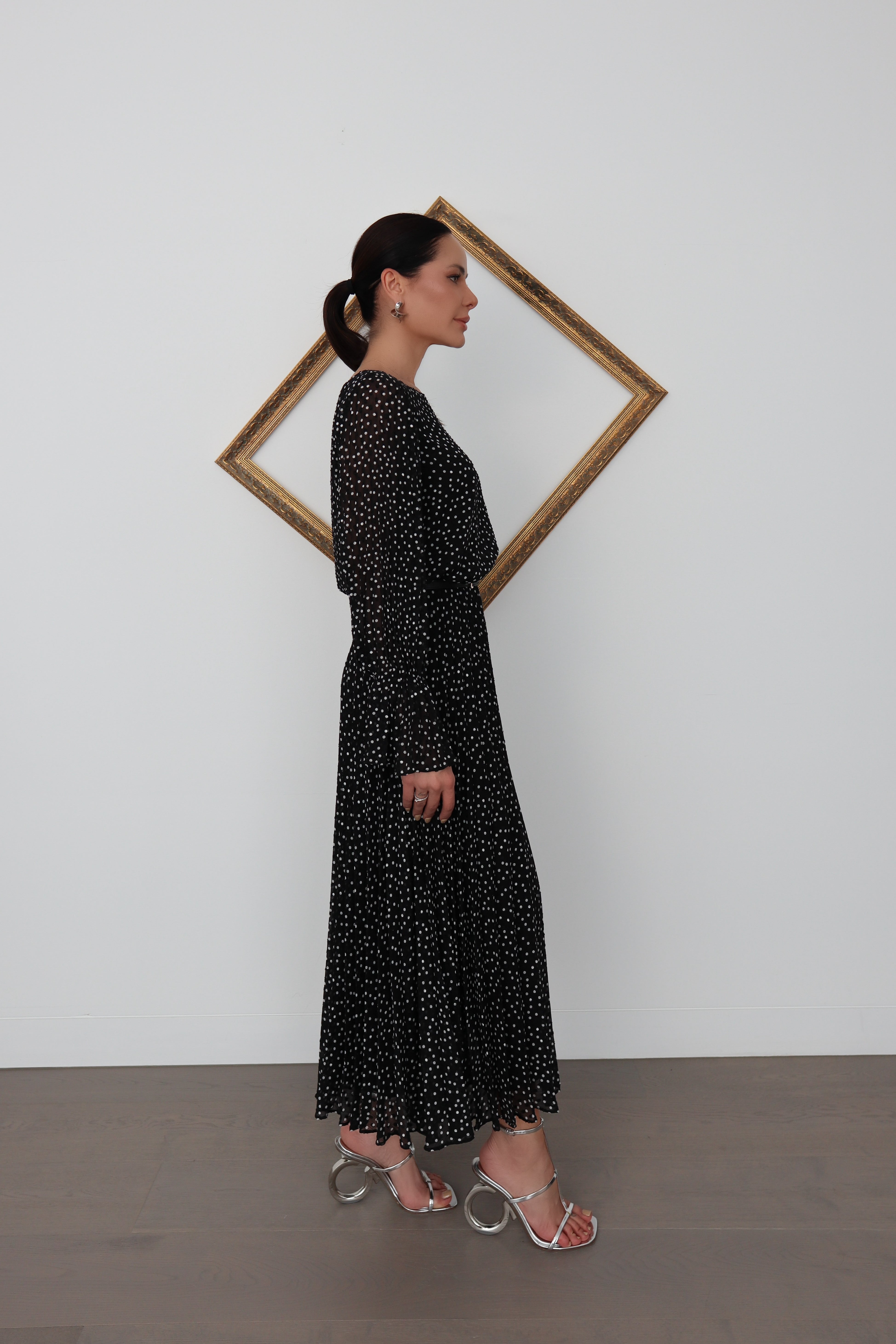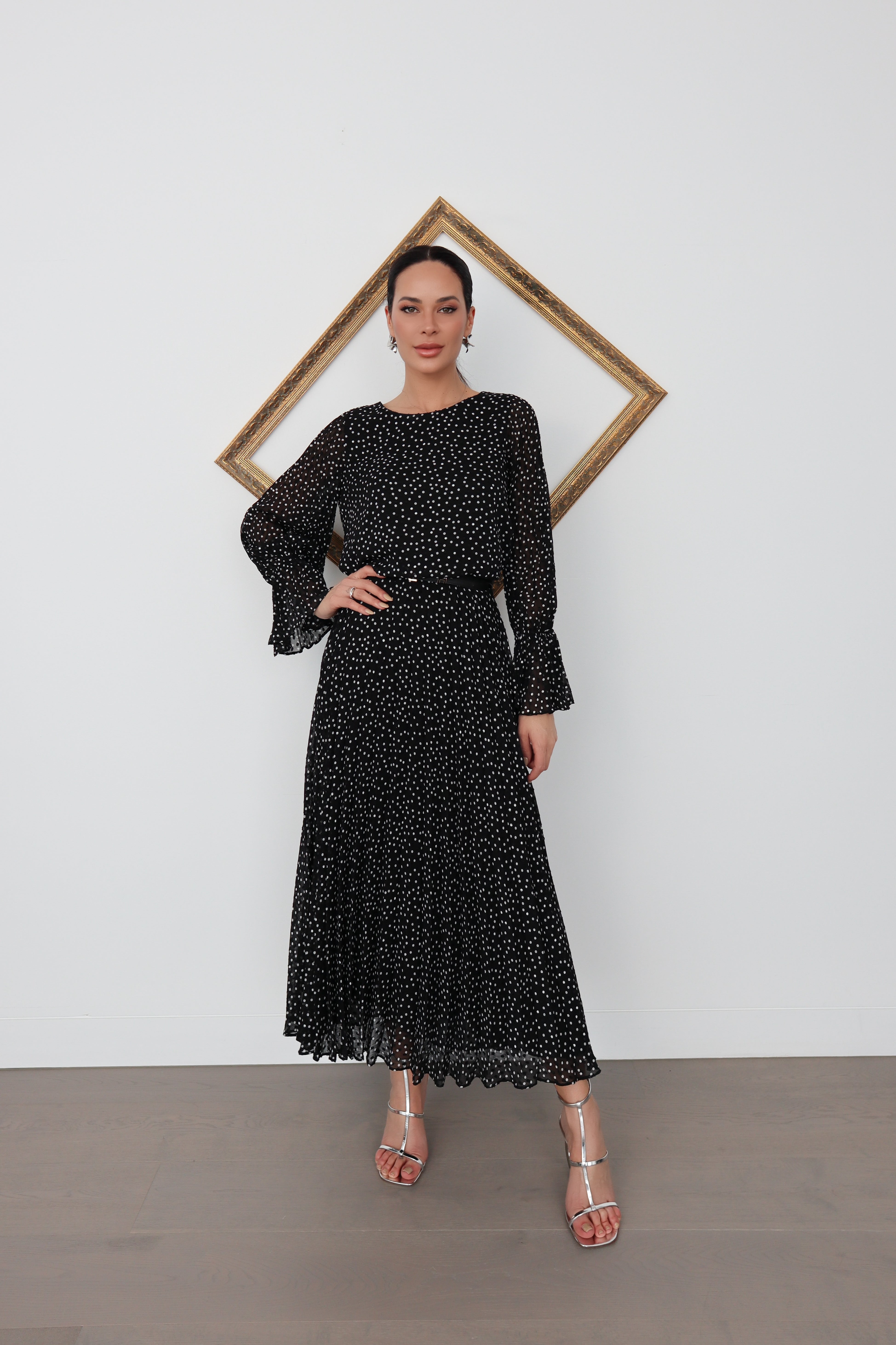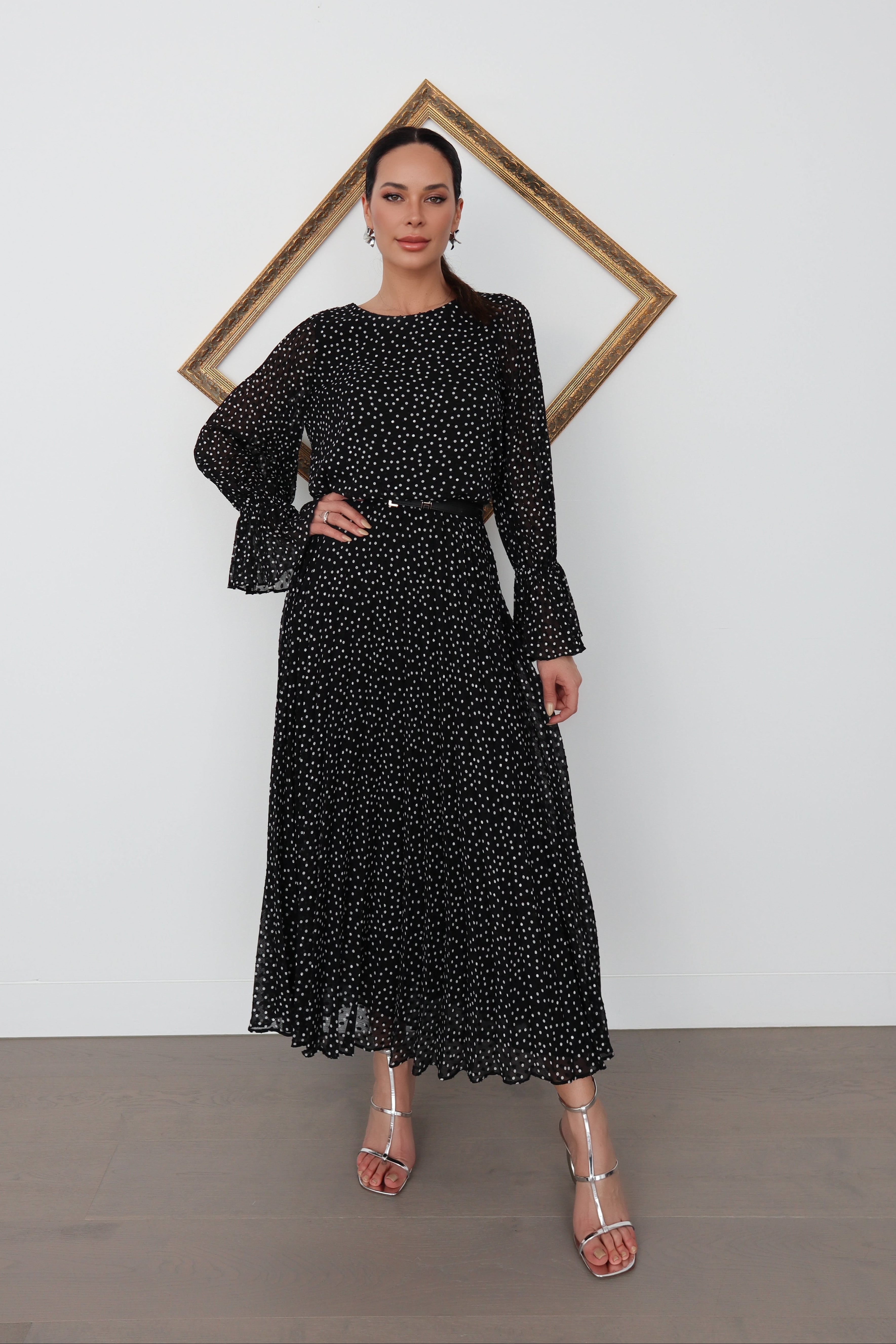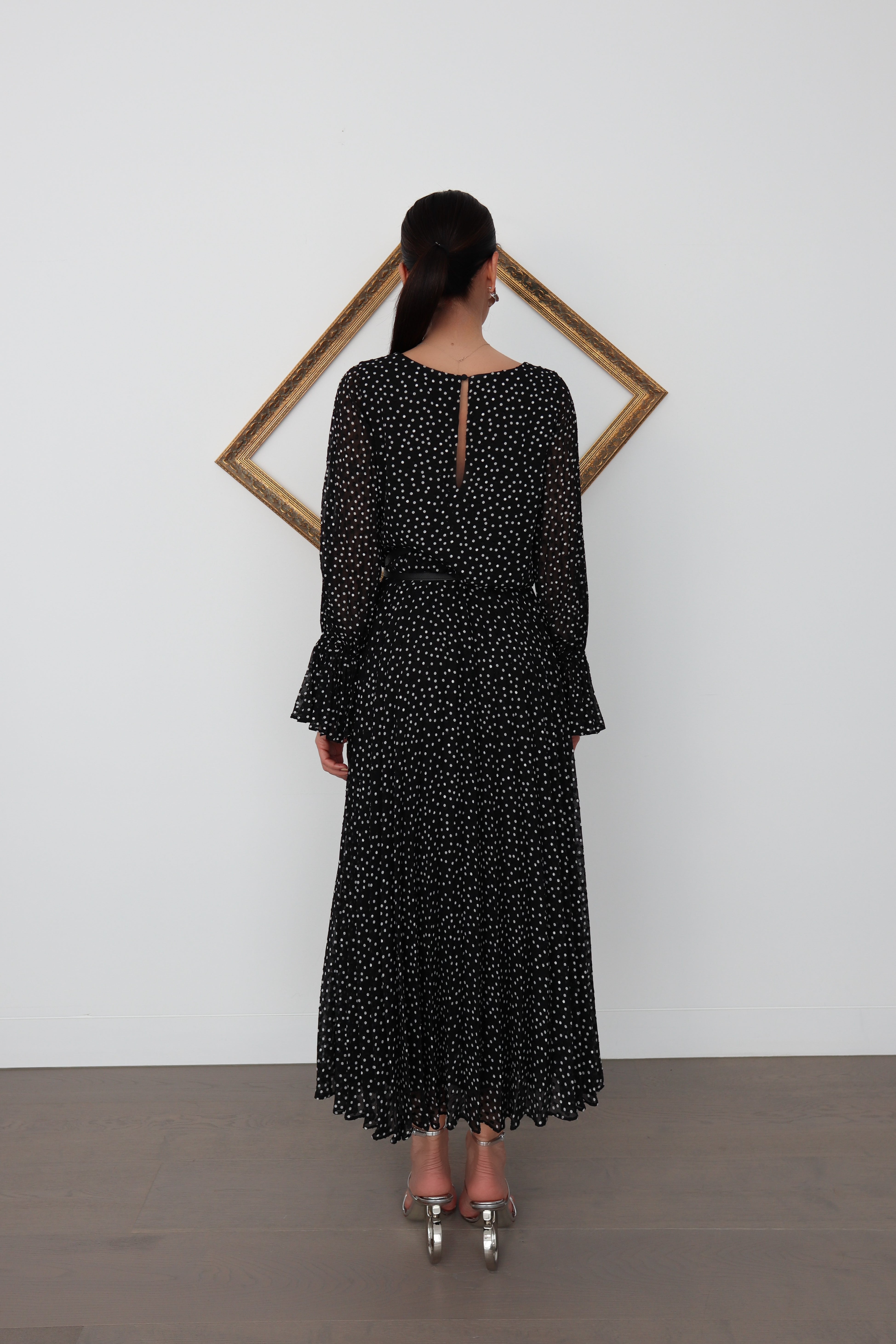 An elegant and effortlessly feminine Emporio Armani long dress crafted in a delicate black chiffon with an all-over white polka dot print. The silhouette features a refined bateau neckline, soft blouson sleeves with subtle volume, and a fluid, pleated skirt that moves beautifully with every step.