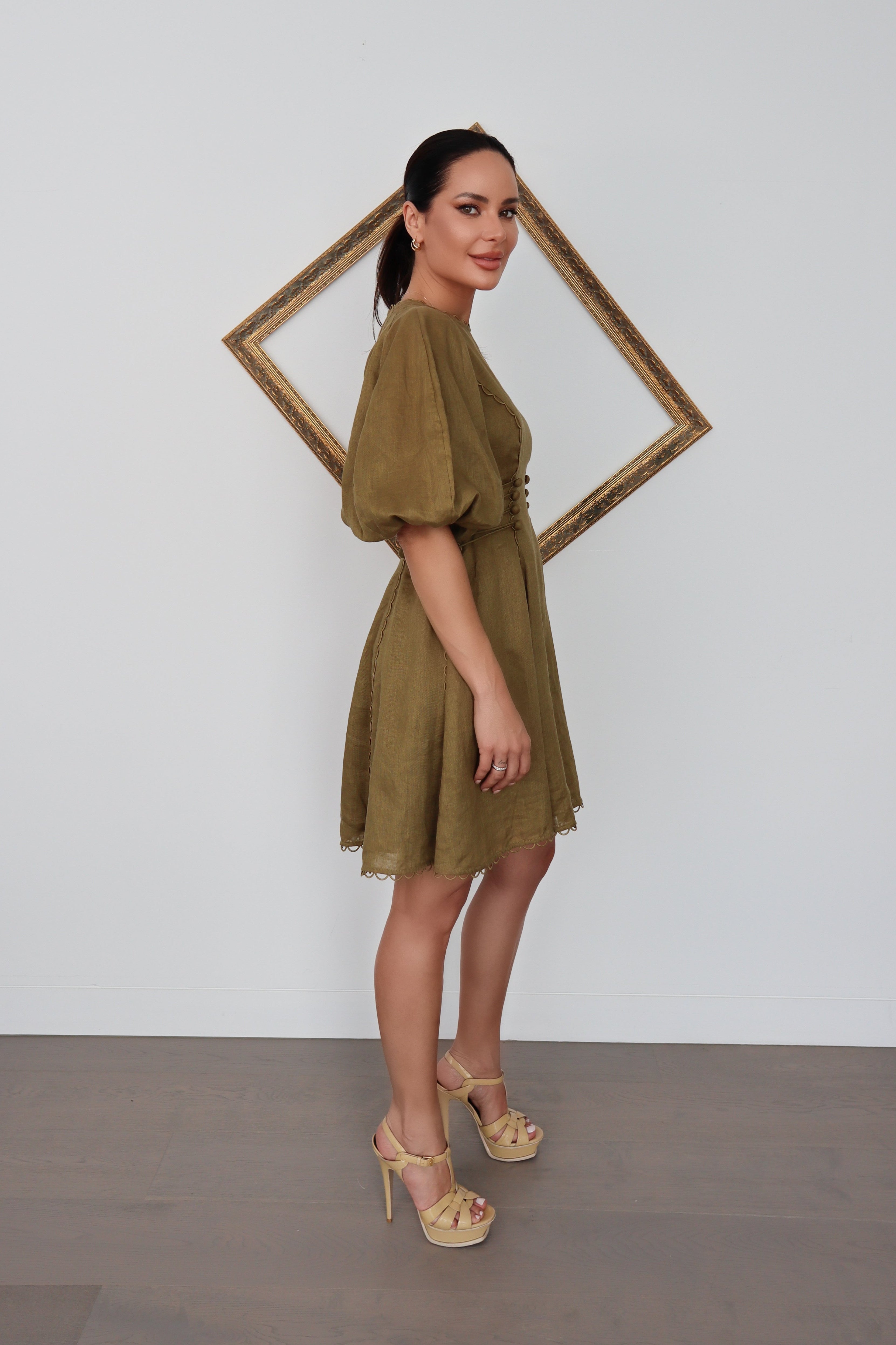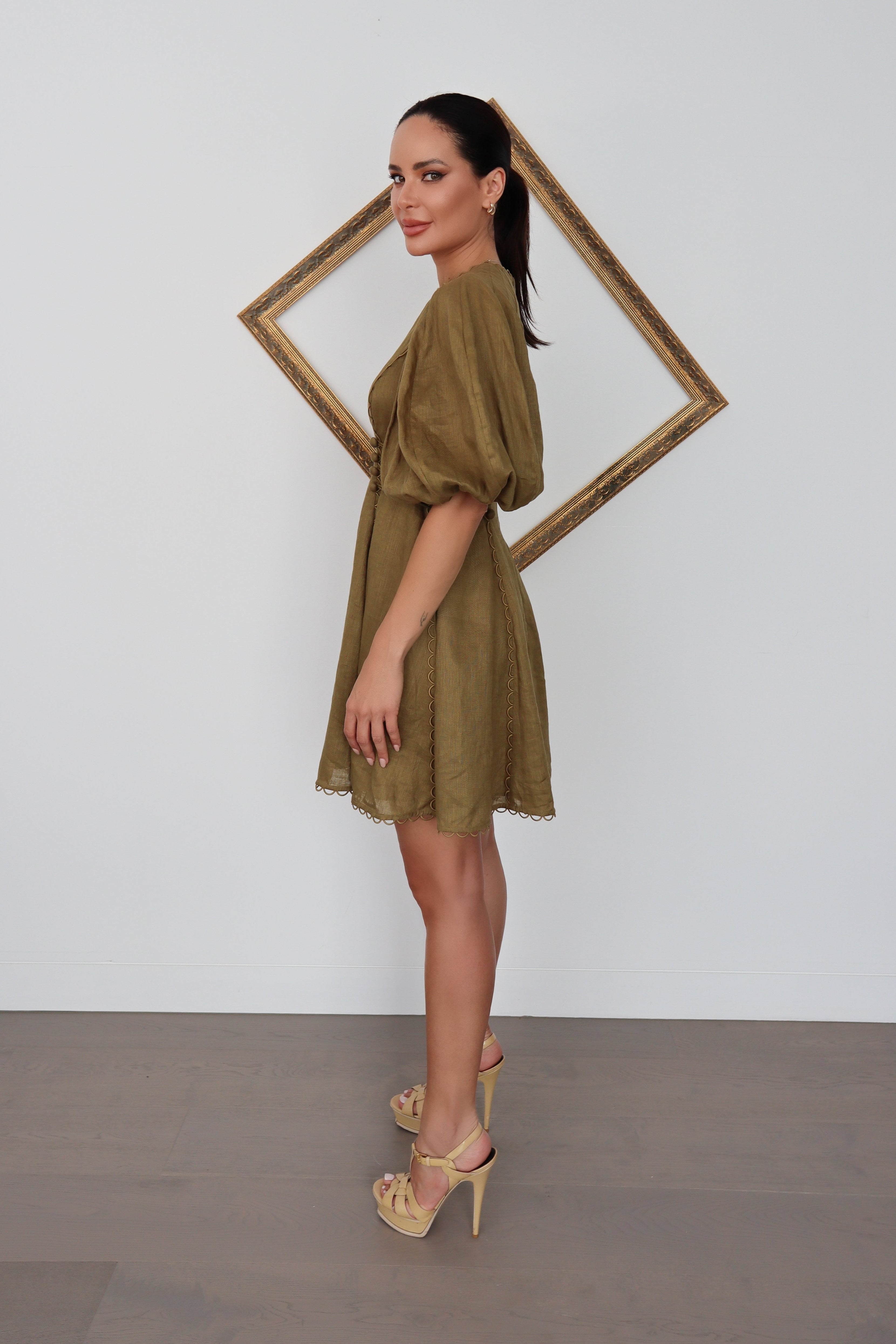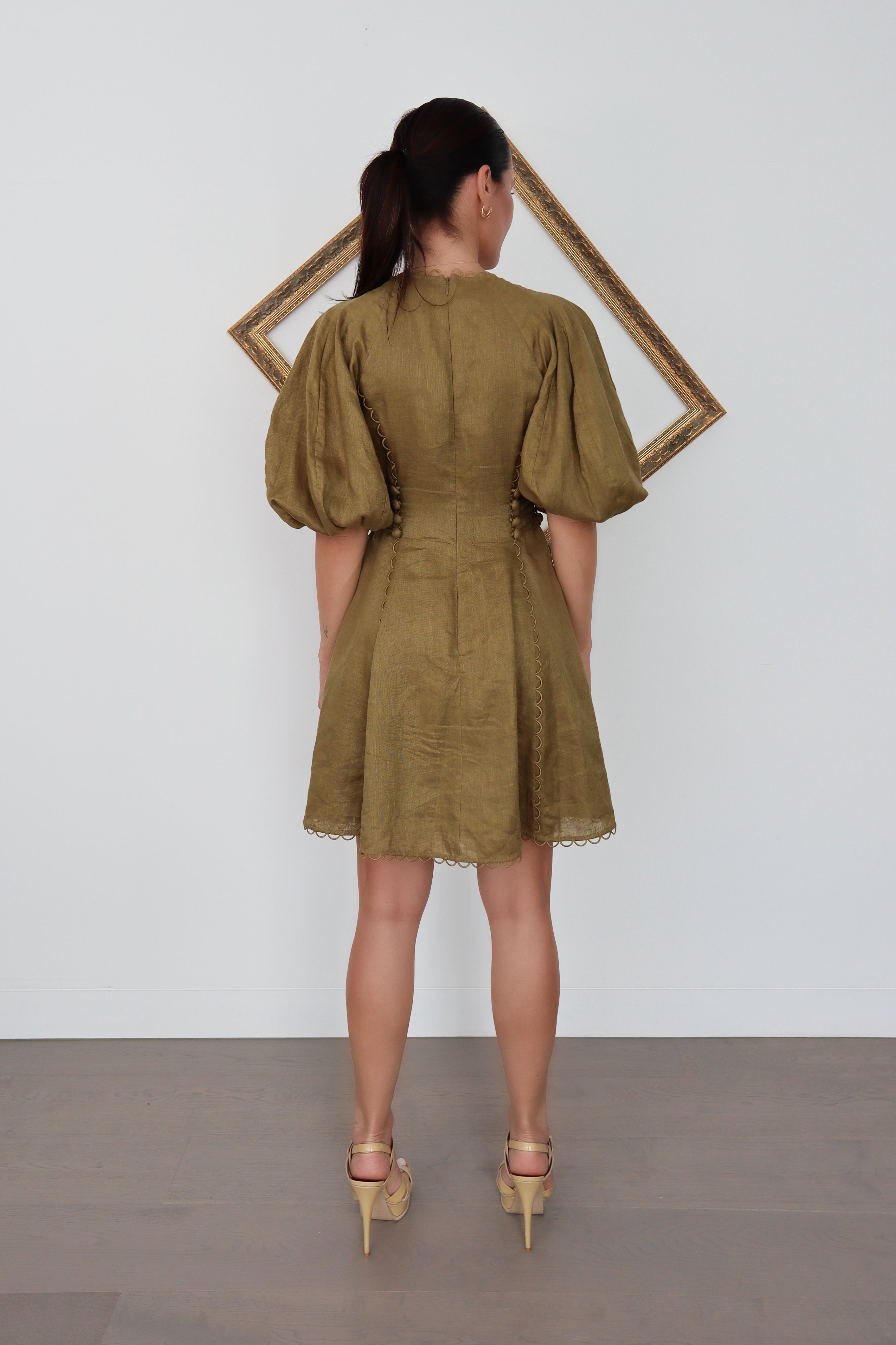 This olive linen mini dress from Zimmermann reflects the brand’s signature balance of femininity and effortless resort tailoring. Cut in a softly structured silhouette, the design highlights the waist while maintaining a light, breathable feel through its natural linen fabrication.