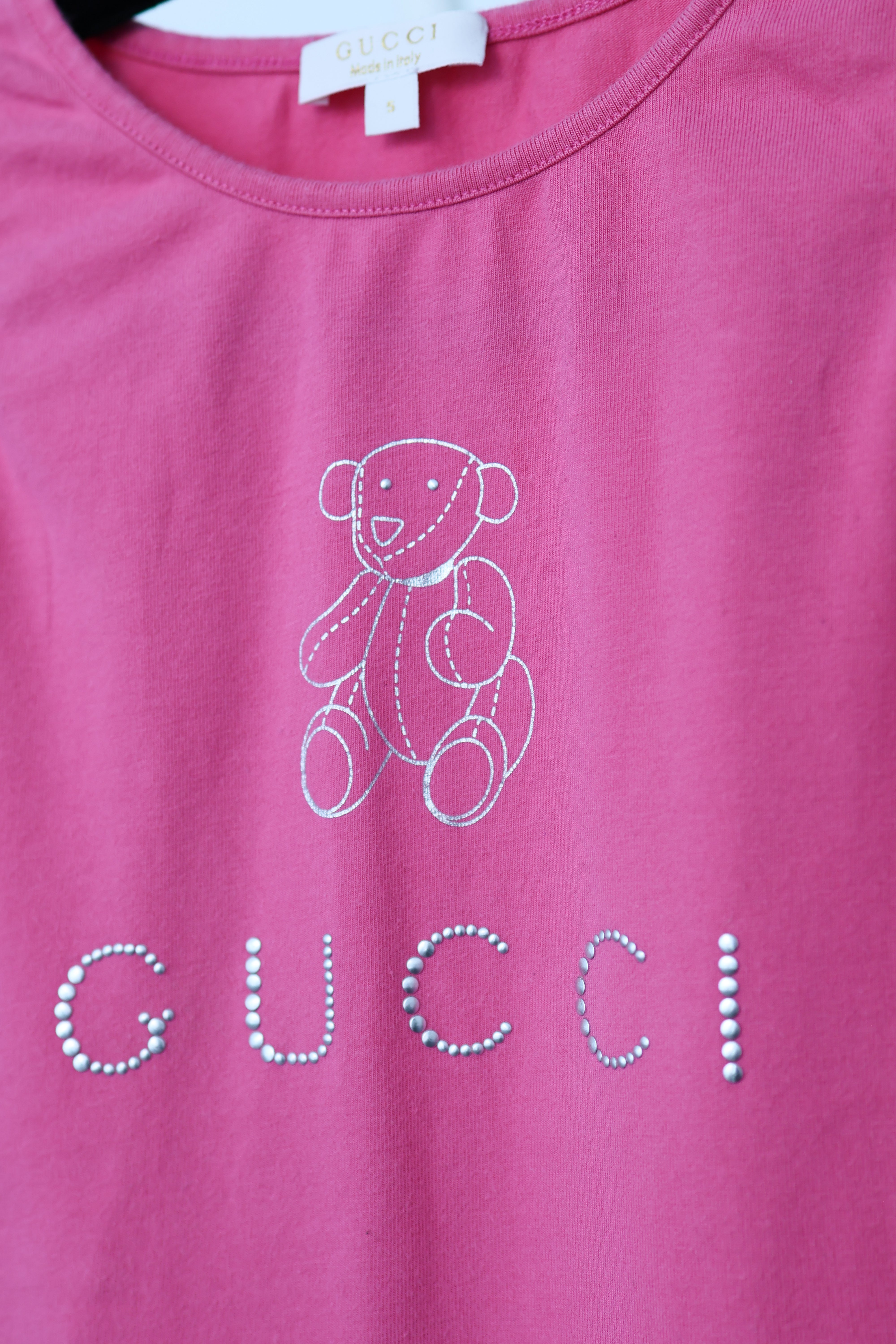 This Gucci Kids T-shirt is crafted from soft pink cotton and finished with an embroidered teddy bear motif, reflecting the house’s playful approach to childrenswear. The silhouette is simple and comfortable, designed for everyday wear while maintaining the distinctive character associated with Gucci’s graphic elements.