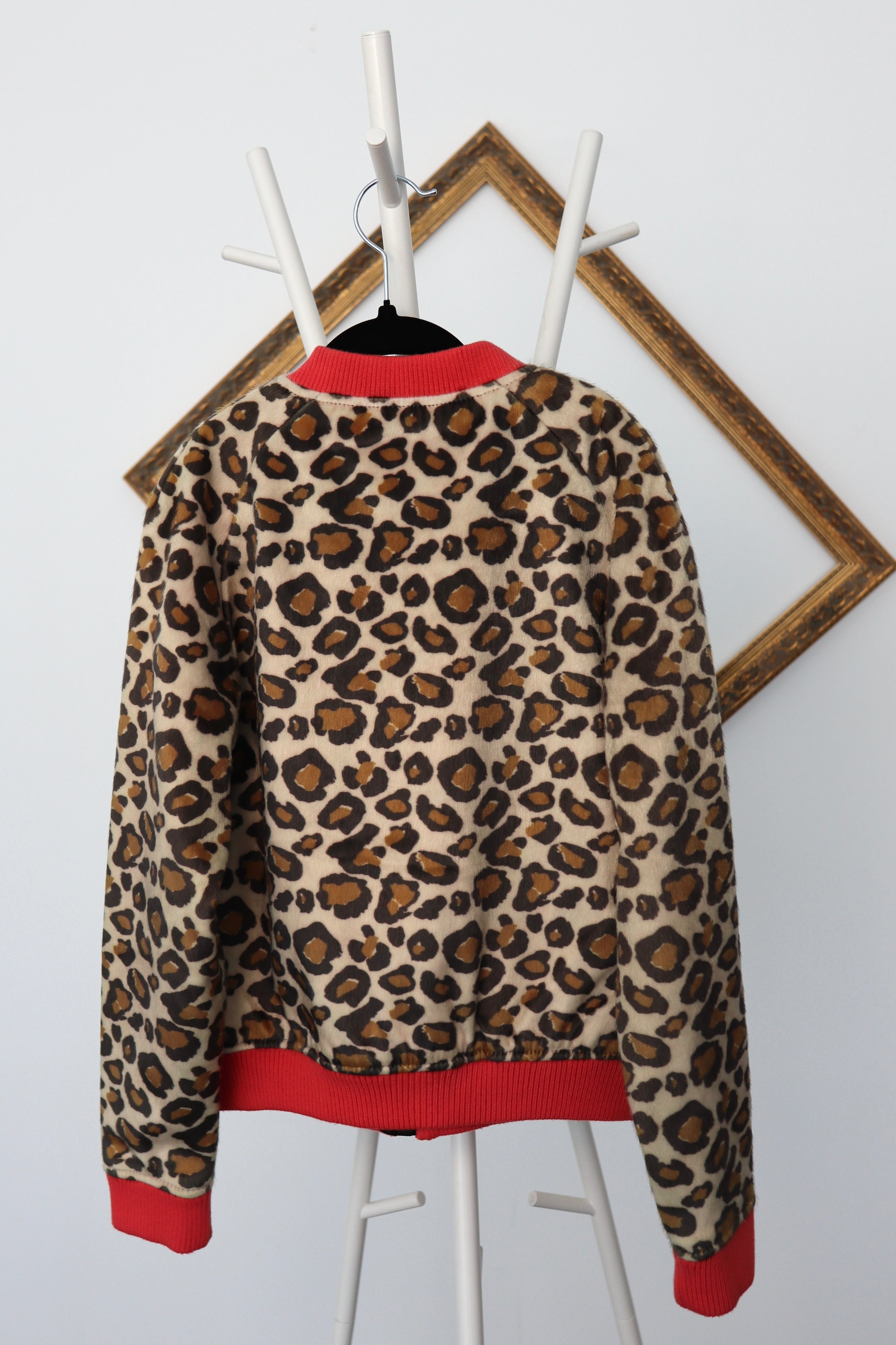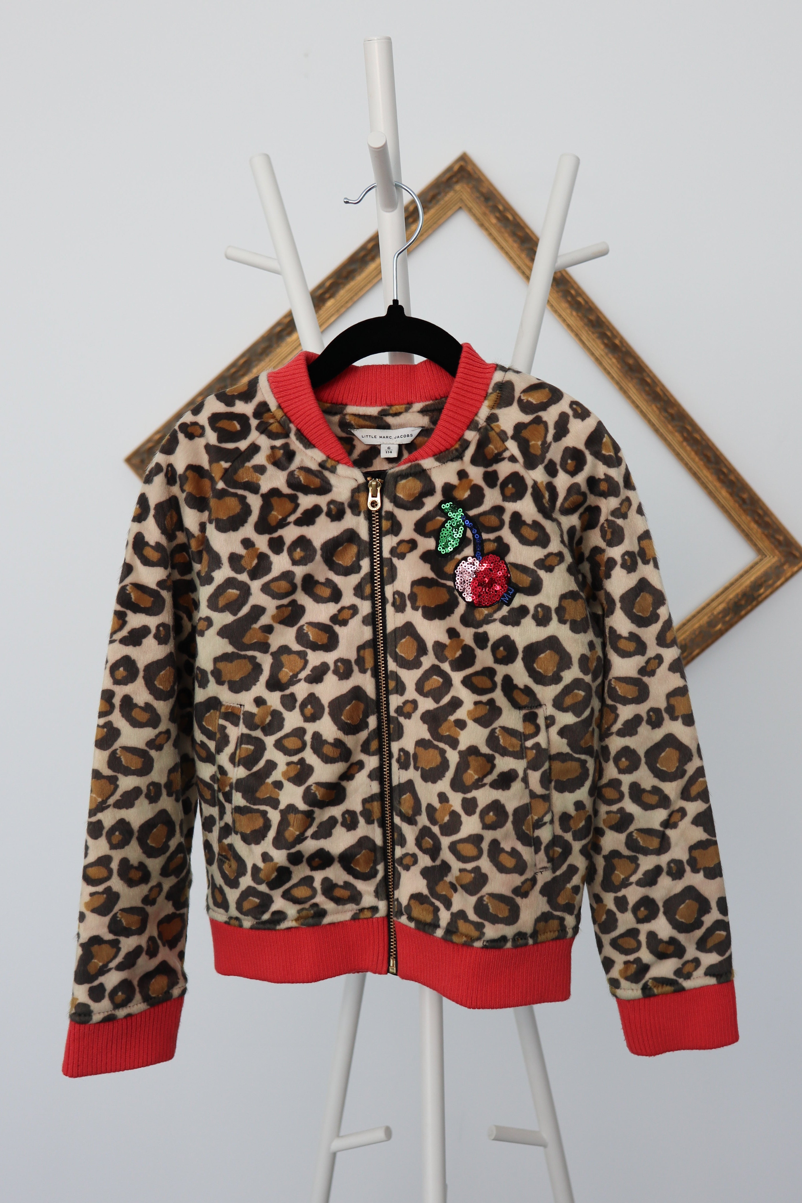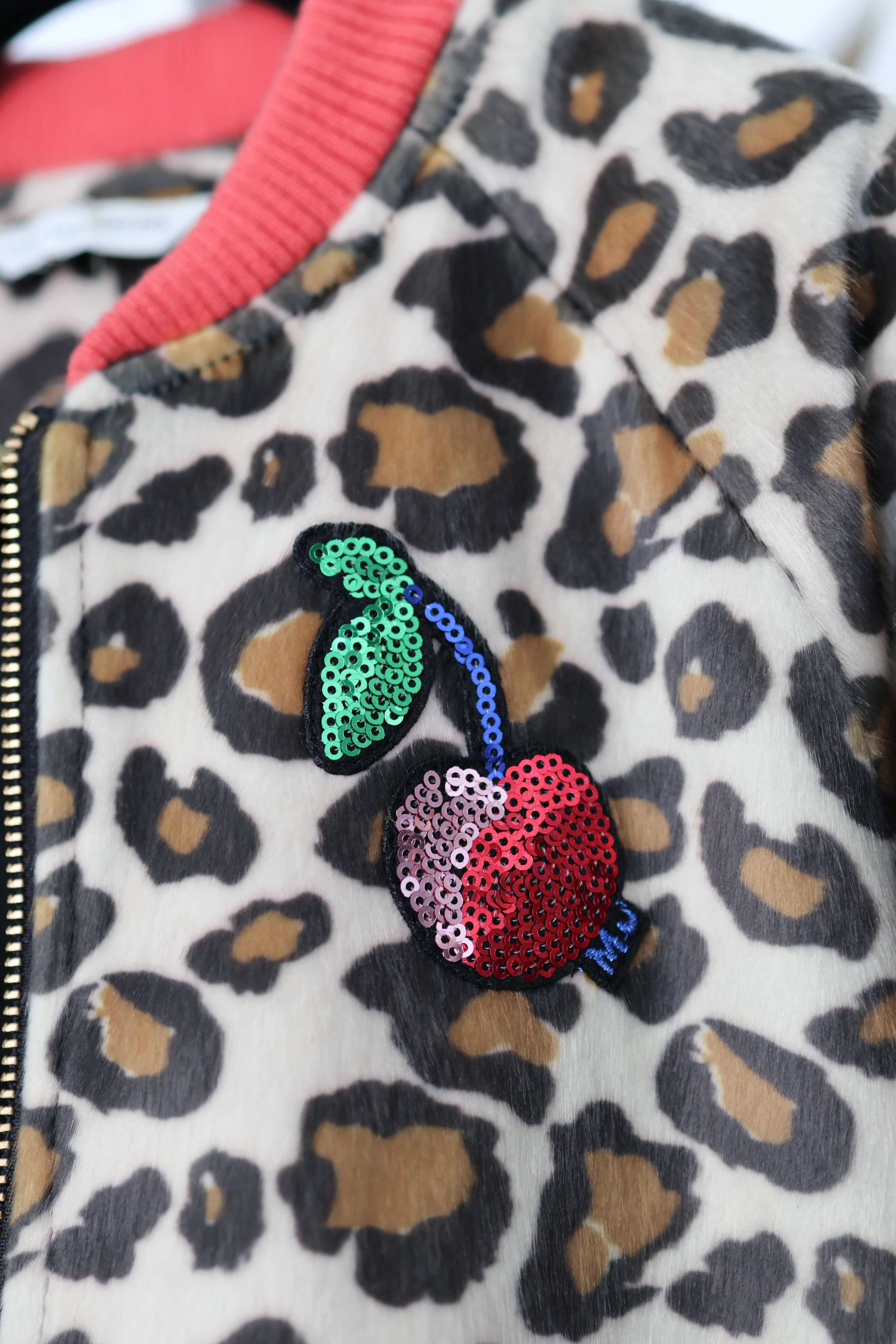 This Marc Jacobs girls’ jacket features a plush faux fur construction finished in a classic leopard print, elevated with a playful sequin cherry patch at the chest. Designed with a zip-front closure and ribbed trim, the silhouette balances warmth with a polished, fashion-forward finish.