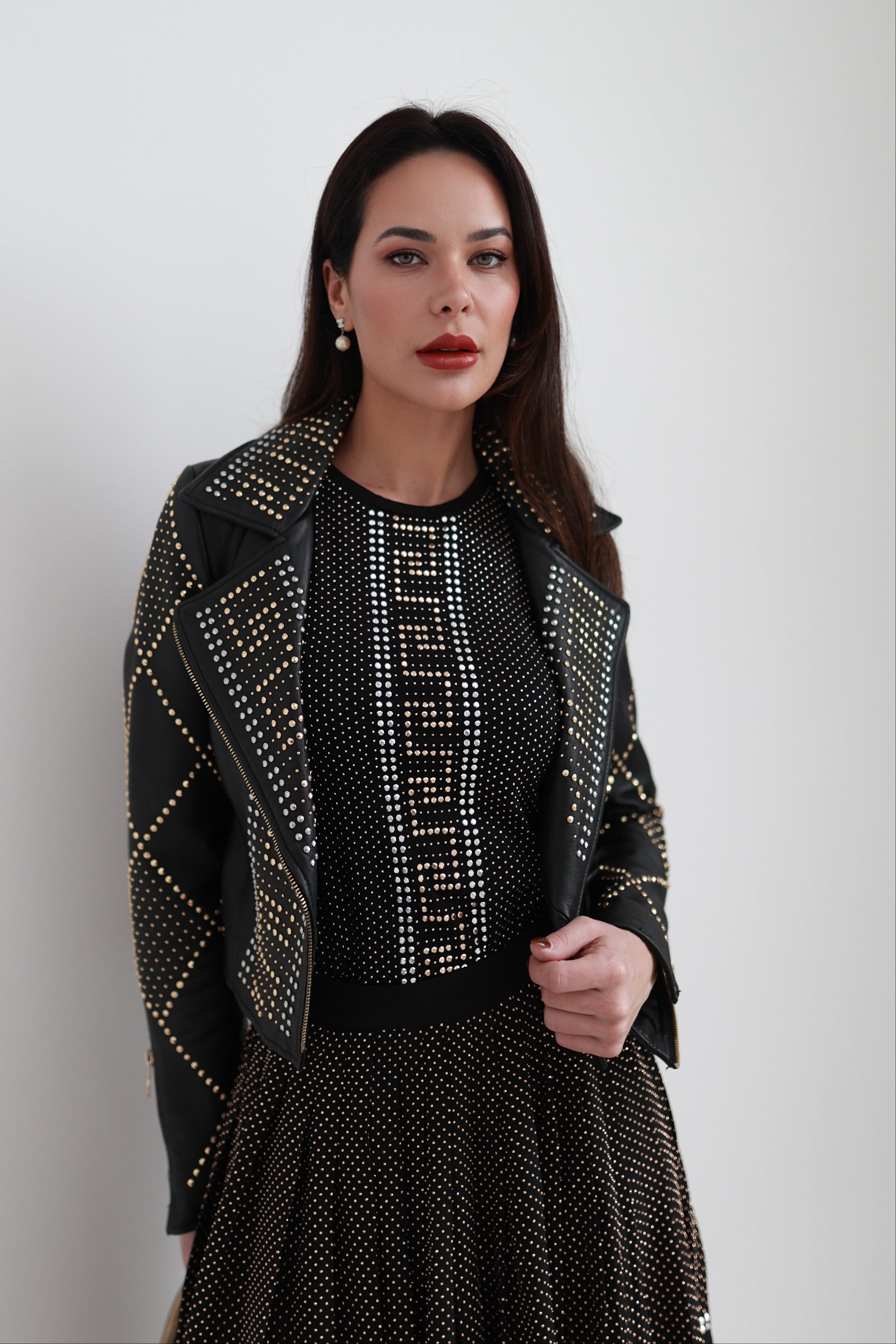 Designed with an all-over studded finish, the top delivers a powerful statement while maintaining a sleek, structured silhouette.