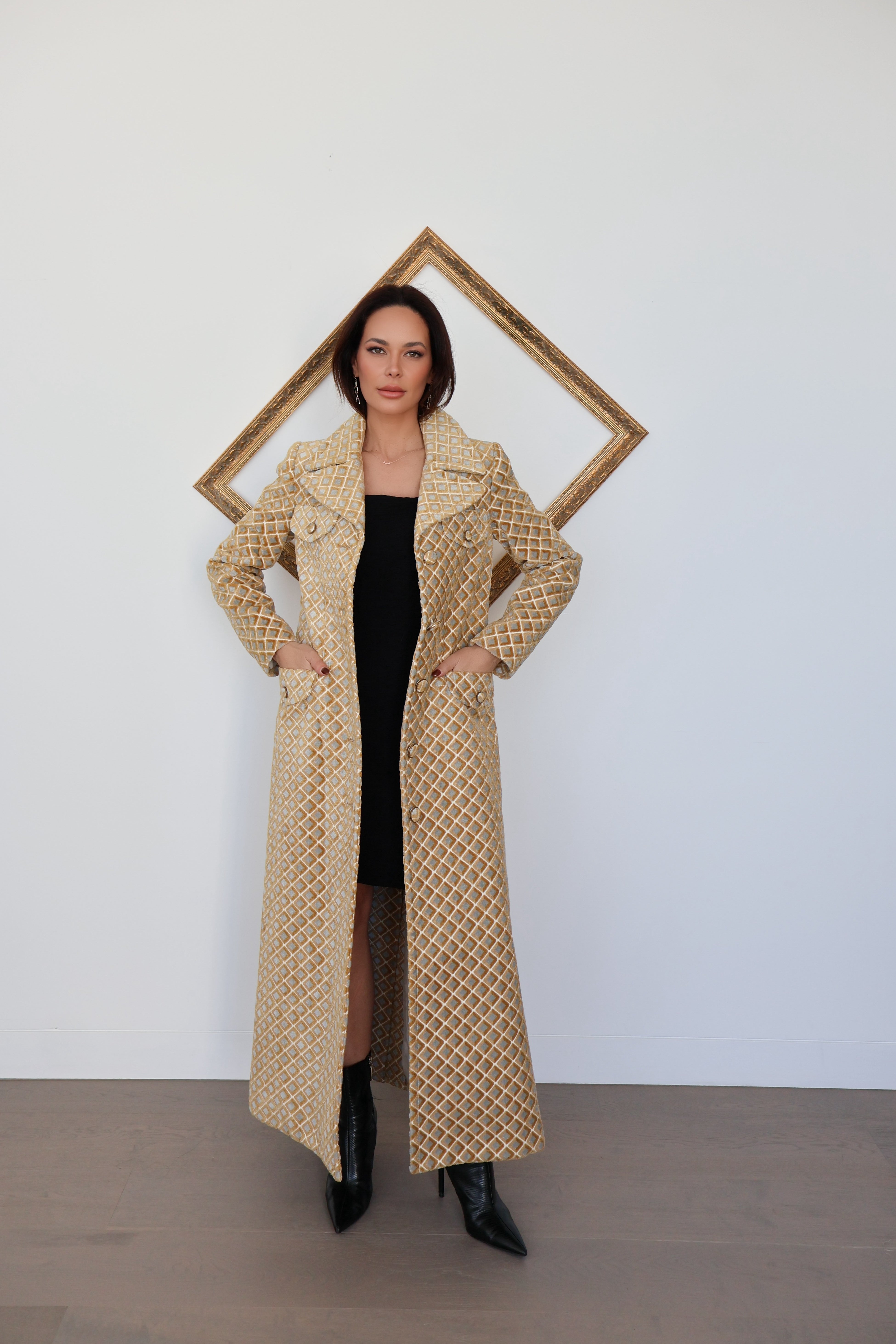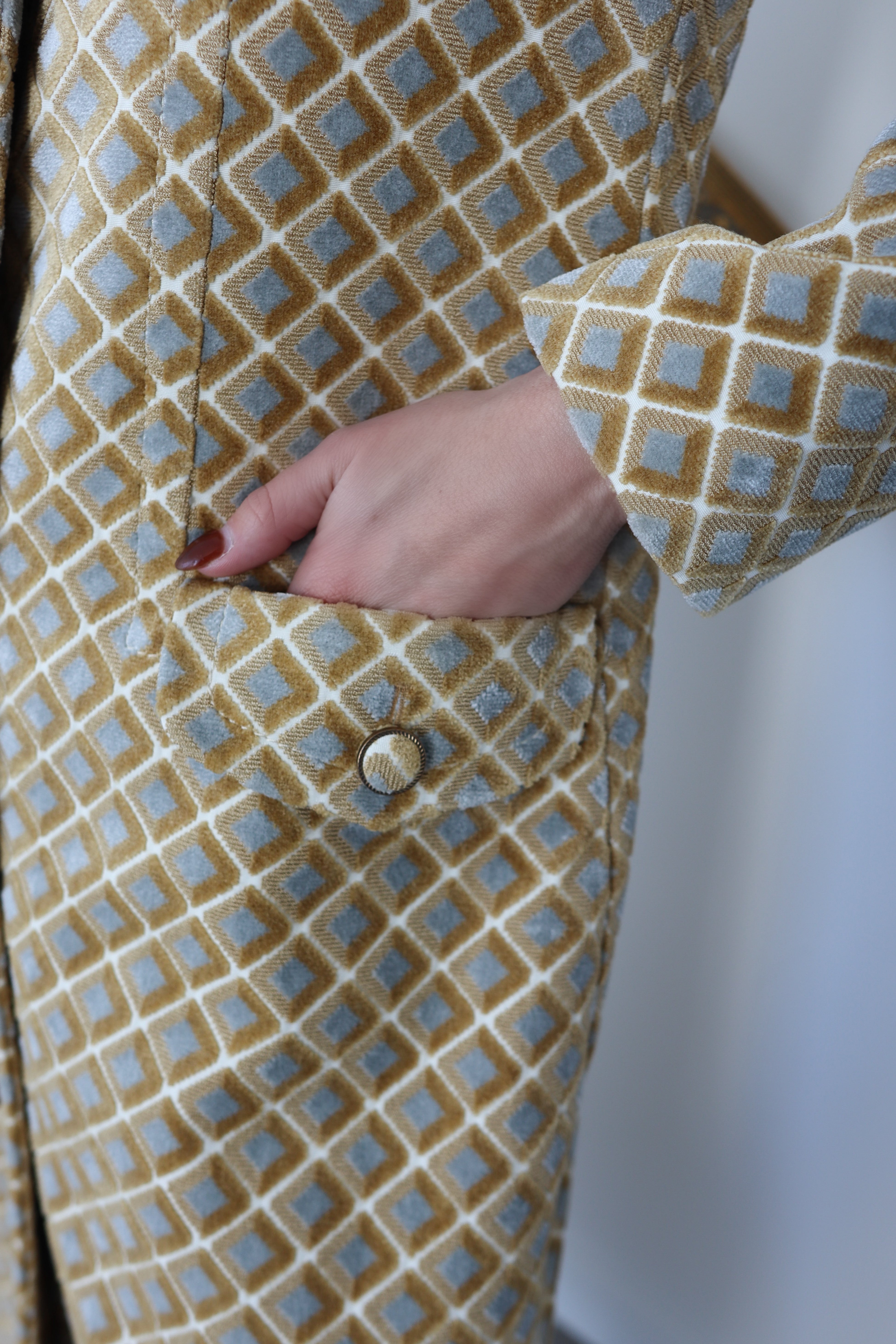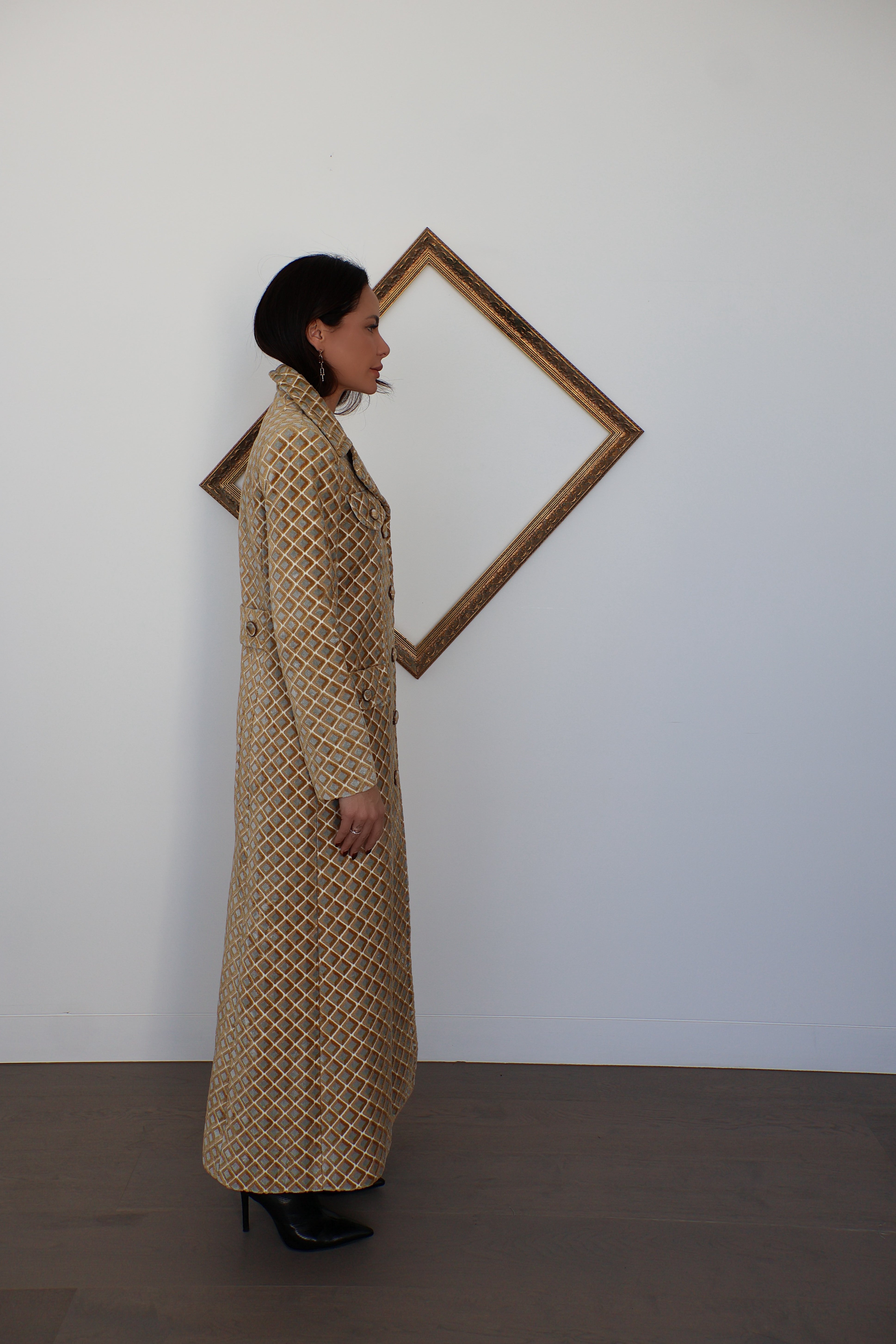 A striking archival-style Zimmermann piece, this longline coat showcases the label’s signature romantic tailoring with a bold geometric twist. Crafted in a gold-yellow and soft grey diamond quilt pattern, the coat drapes beautifully to the ankle, creating an elongated, sculptural silhouette.