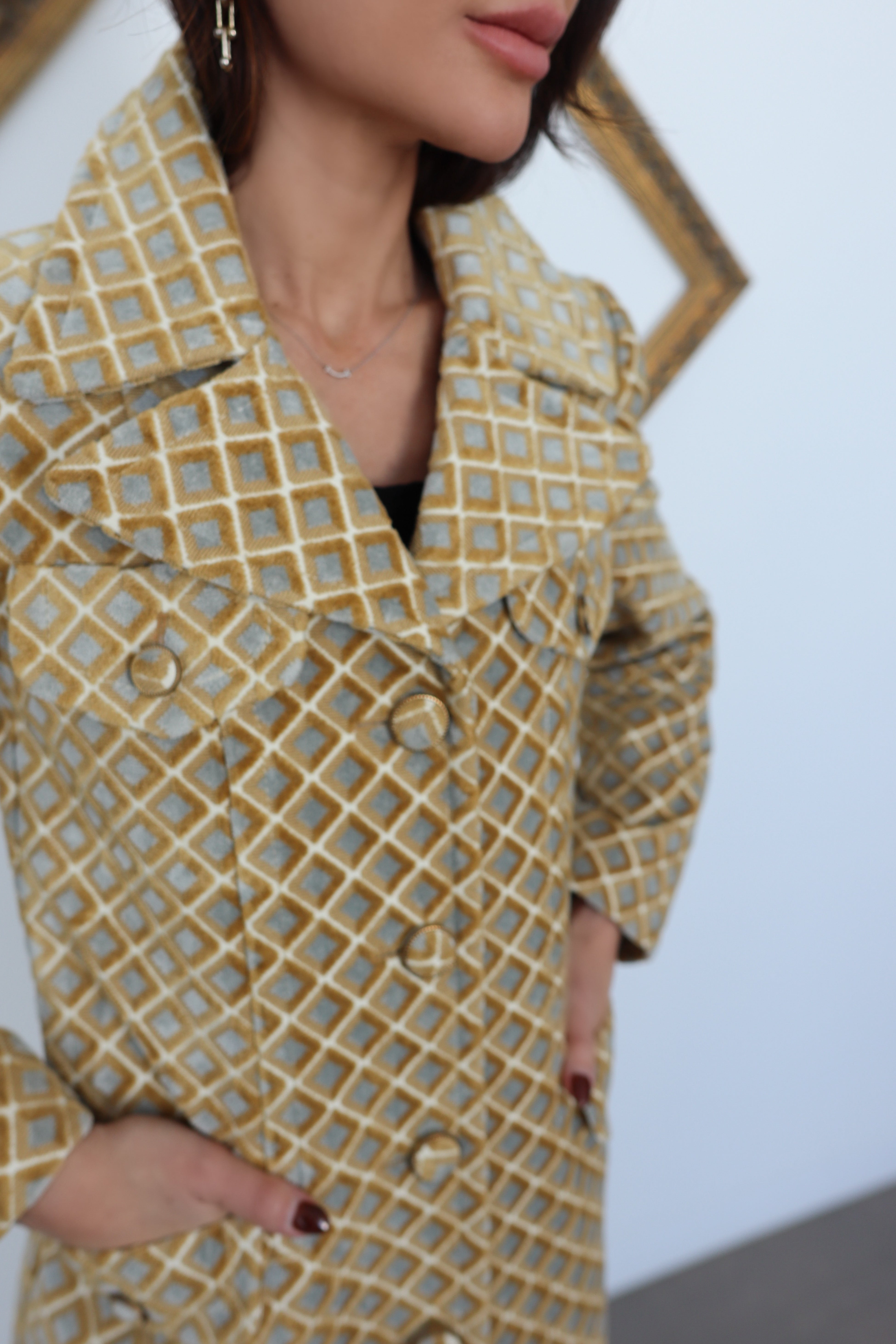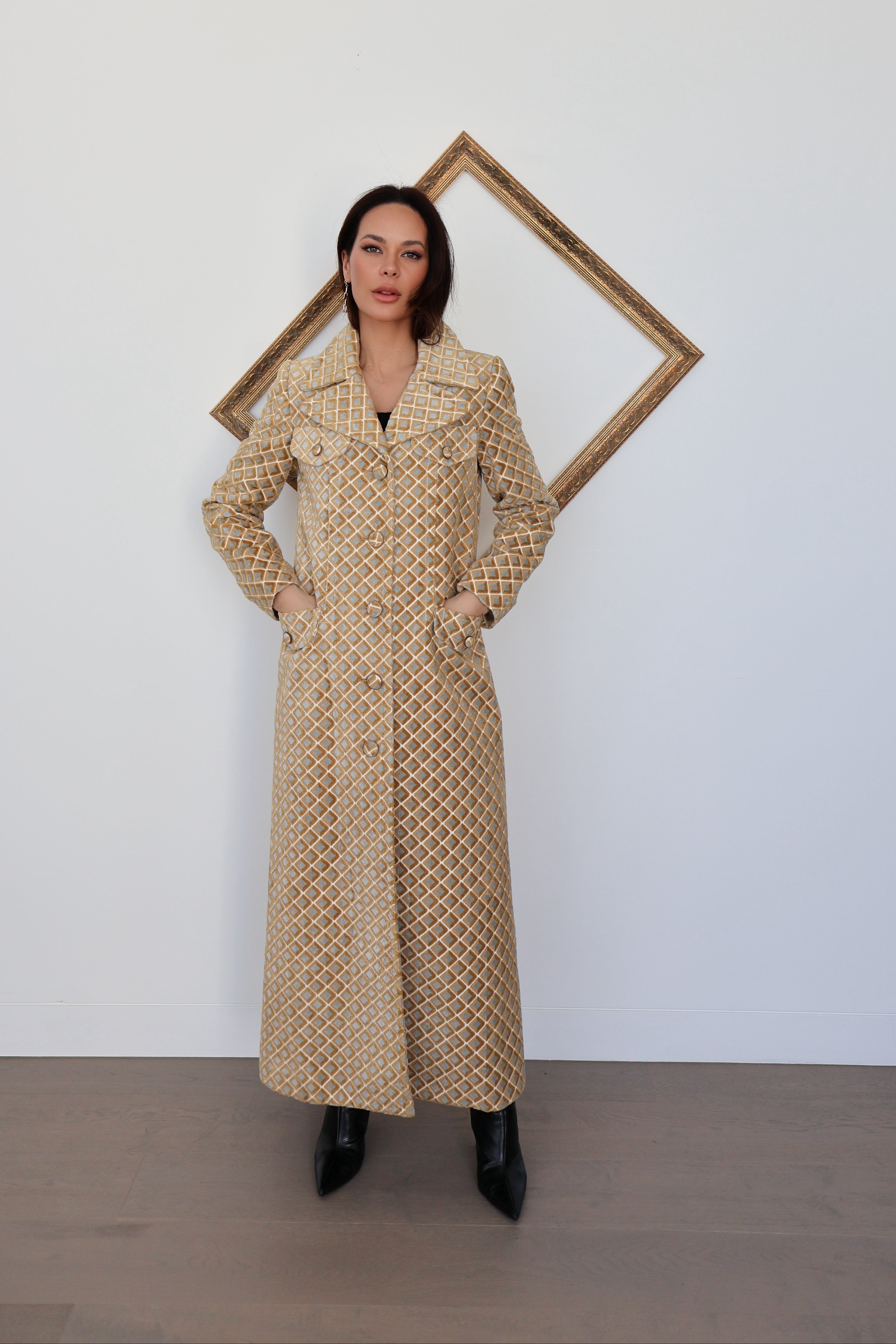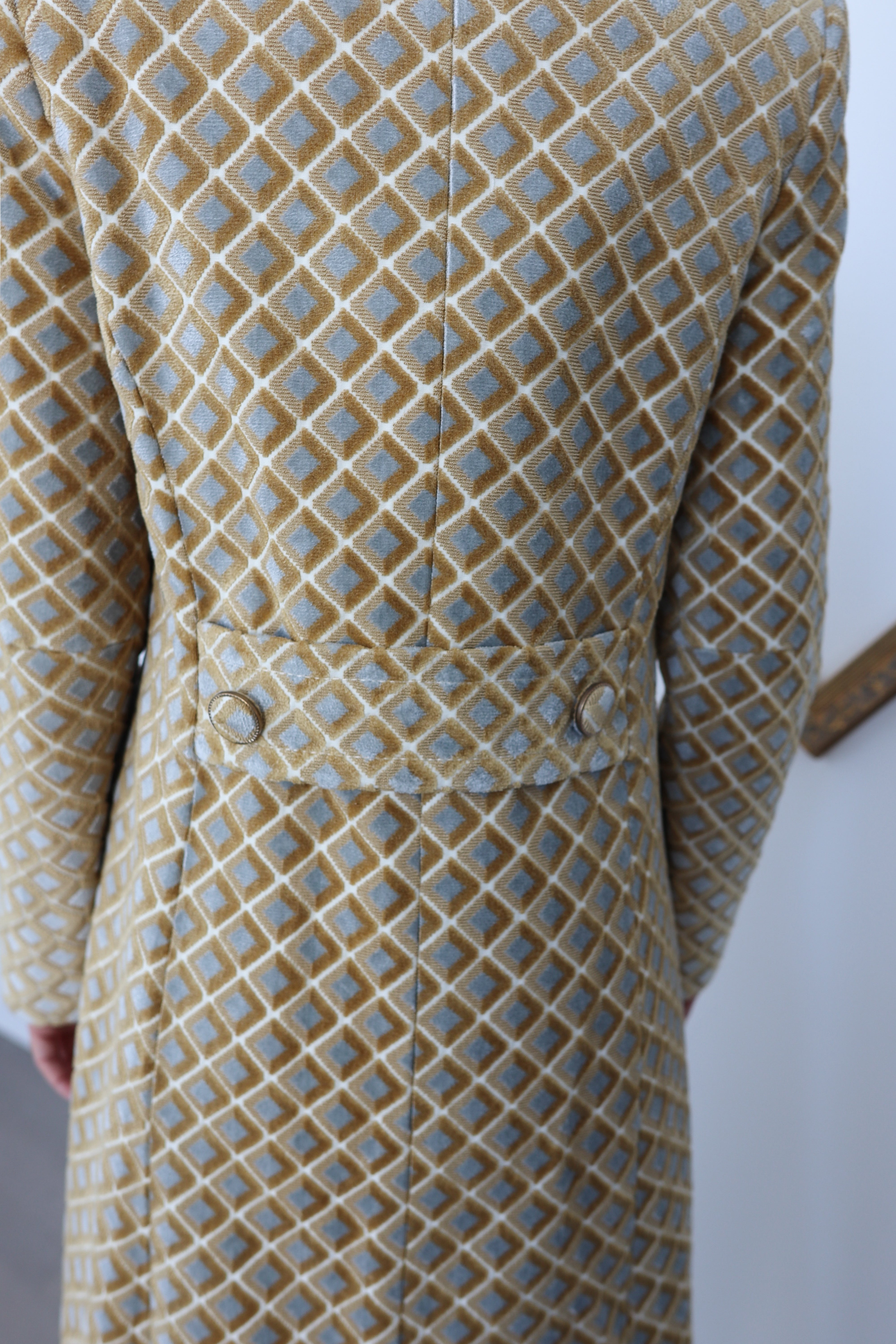 A striking archival-style Zimmermann piece, this longline coat showcases the label’s signature romantic tailoring with a bold geometric twist. Crafted in a gold-yellow and soft grey diamond quilt pattern, the coat drapes beautifully to the ankle, creating an elongated, sculptural silhouette.
