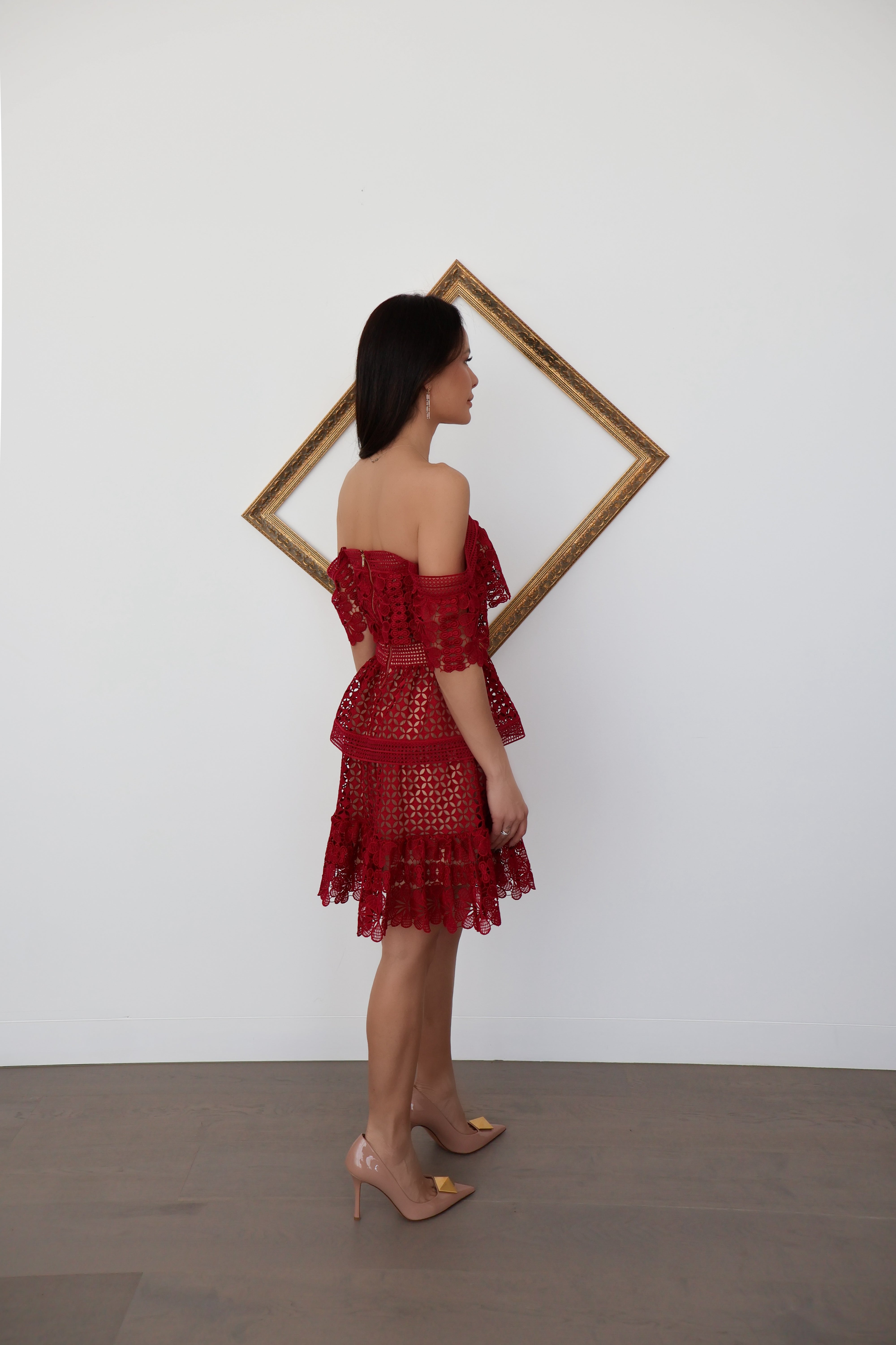 The dress is fully lined through the body for coverage, allowing the sculptural lace pattern to stand out against the skin. It’s the kind of piece that instantly feels dressed-up, even with minimal accessories.Colour: Red