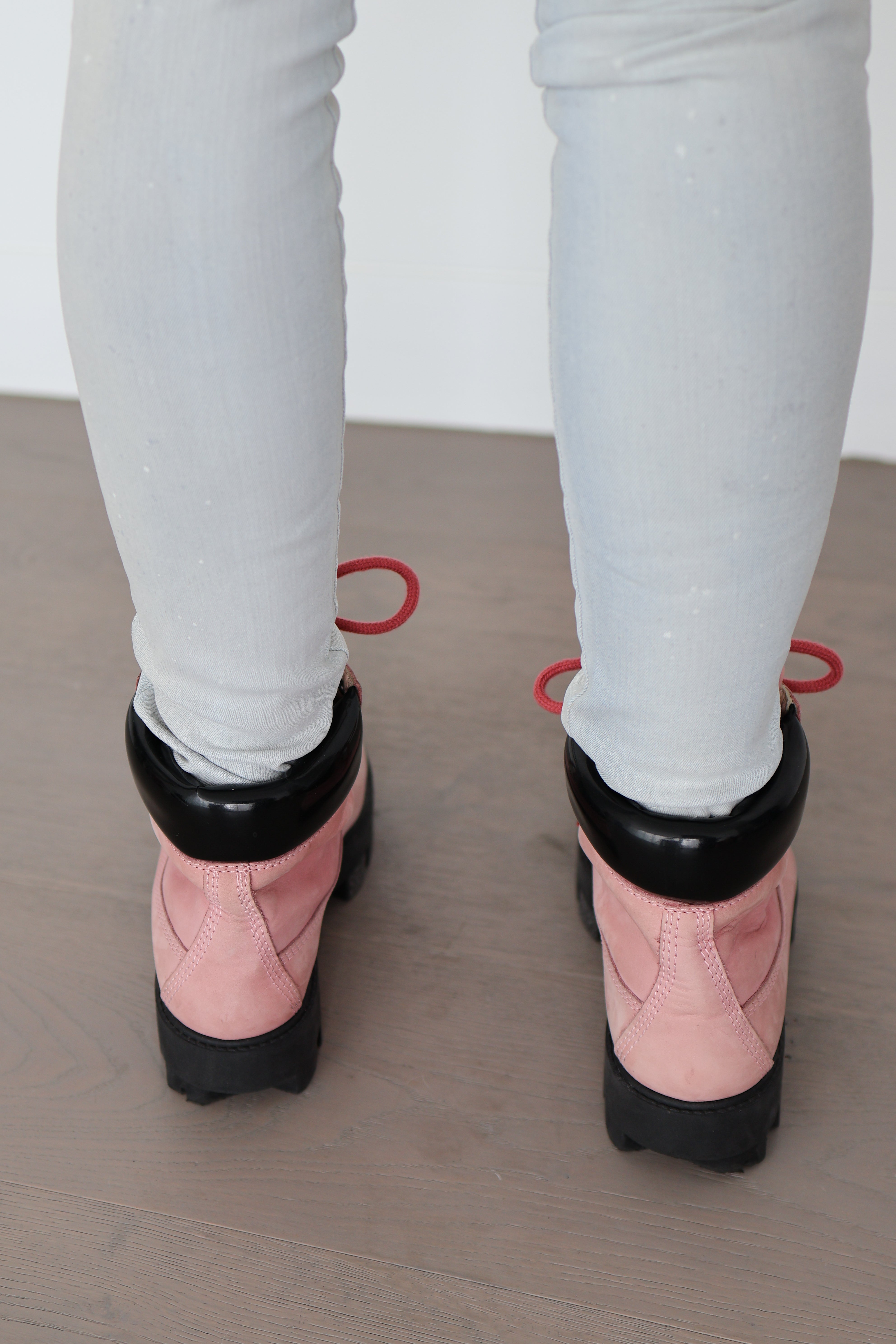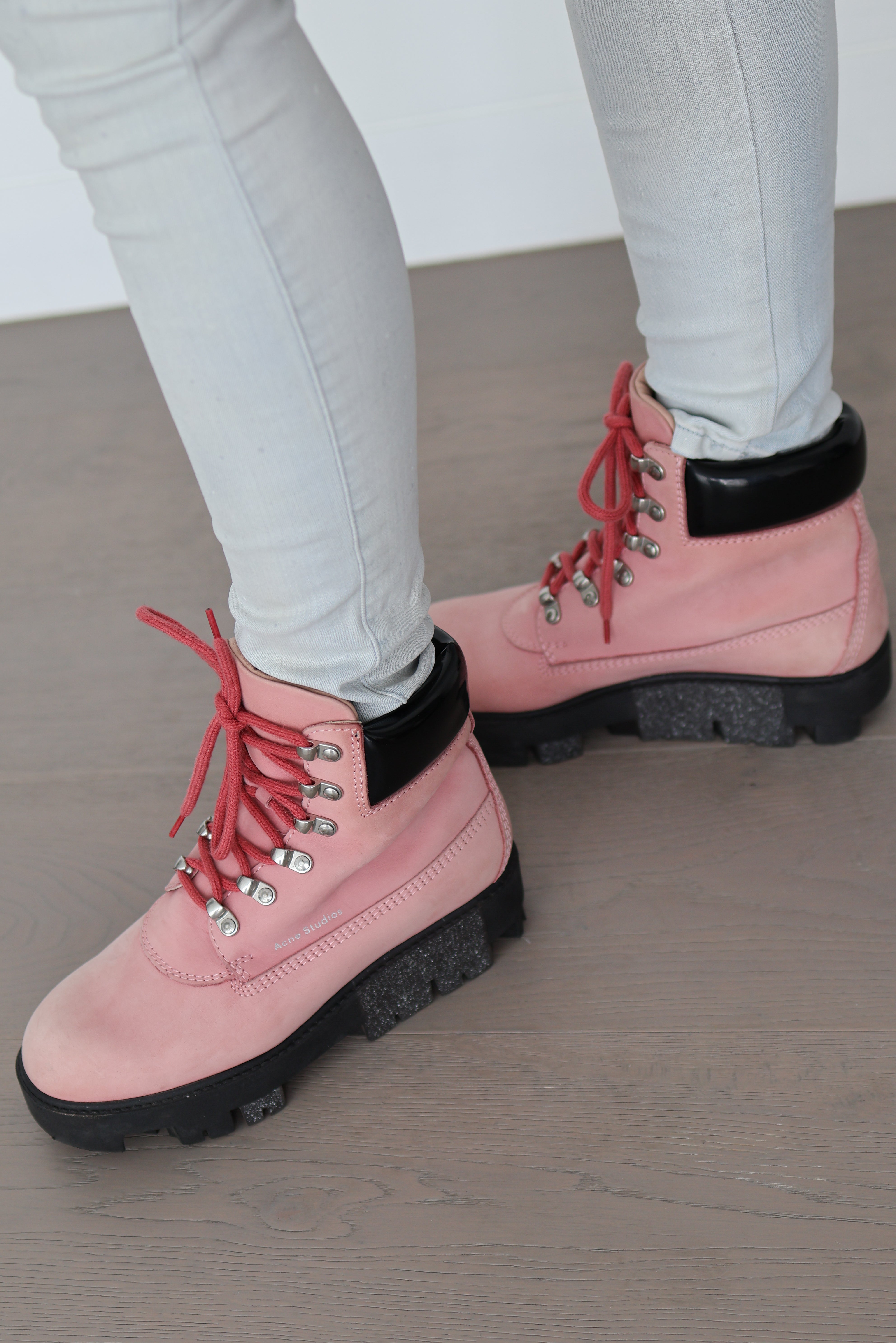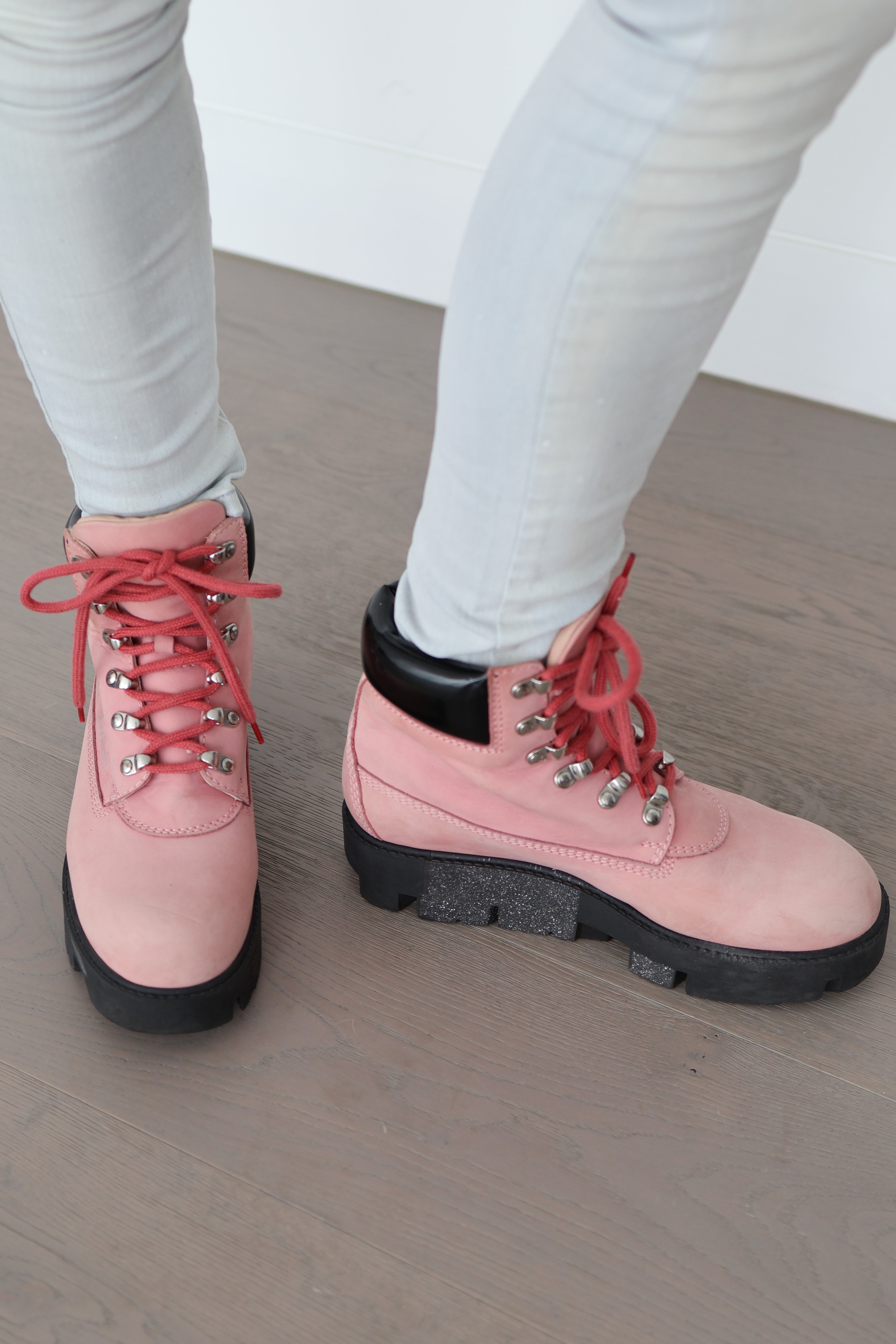 The structured silhouette and rugged sole contrast beautifully with the soft pink leather, making this pair a standout statement while remaining wearable for everyday styling.