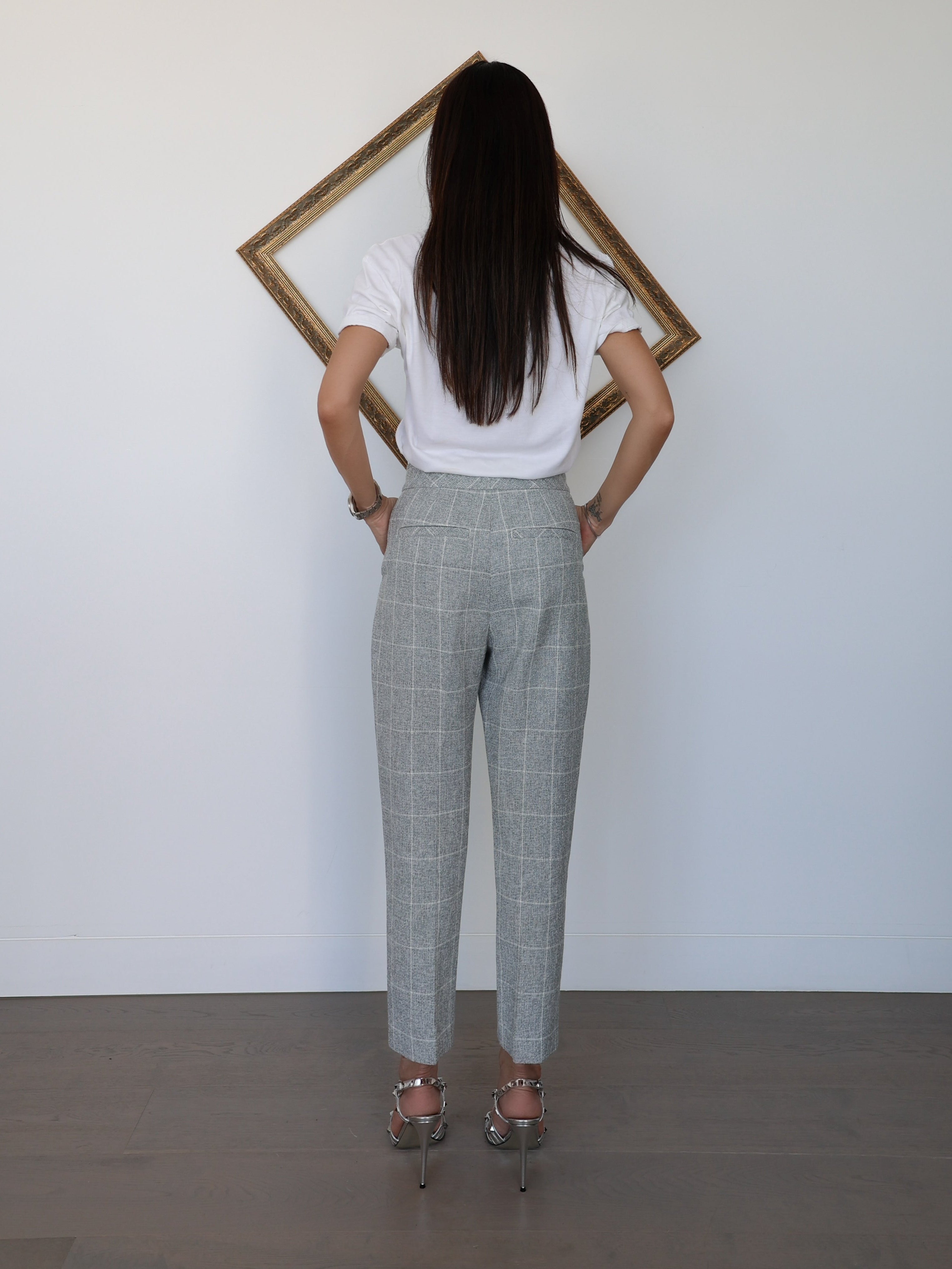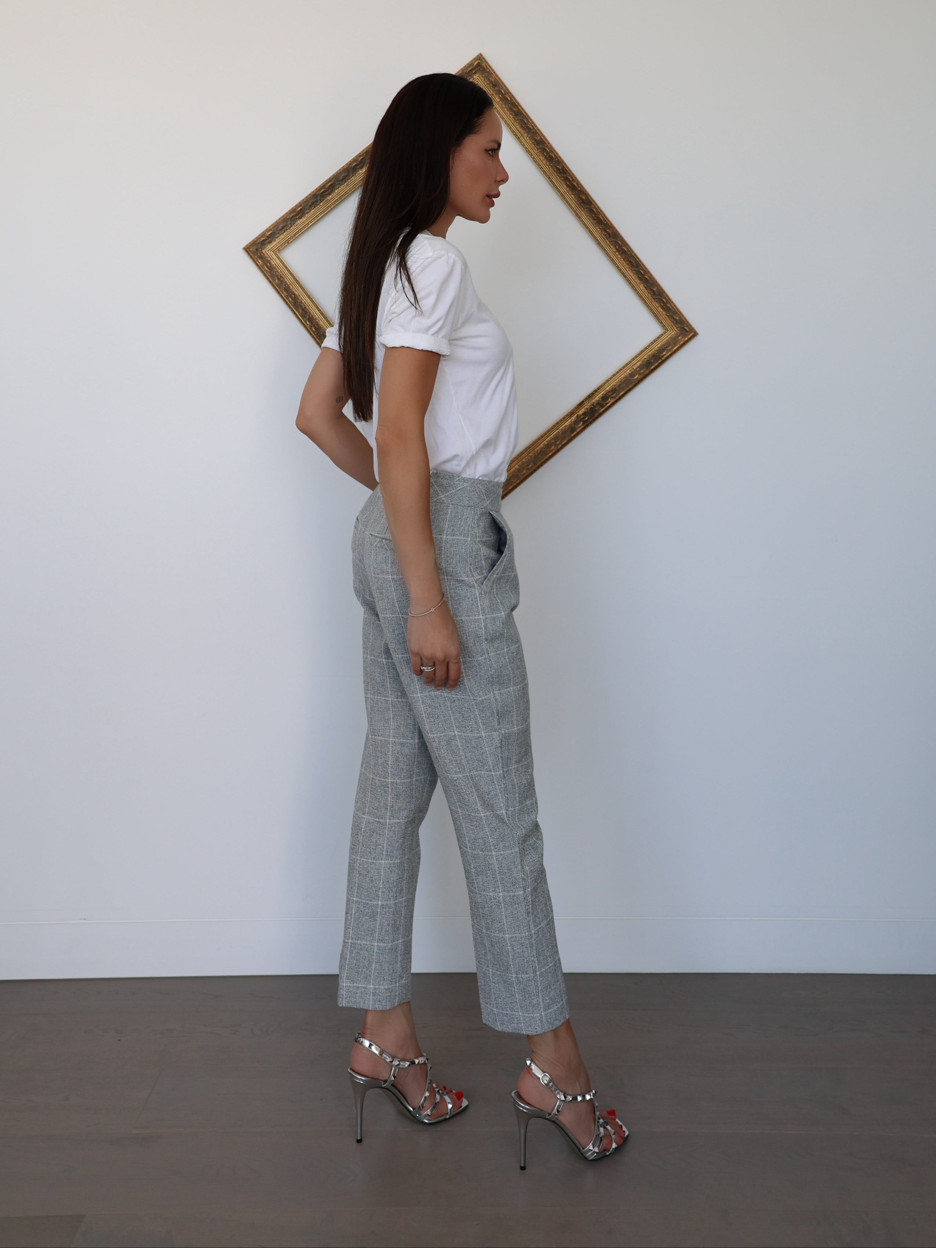 Crafted in a grey check fabrication, the Sappho trouser features a high-rise waist, tapered leg, and crisp front pleats that create a clean, streamlined finish. The tailored shape offers versatility, transitioning seamlessly from professional workwear to elevated off-duty styling when paired with knits, shirting, or relaxed blazers.