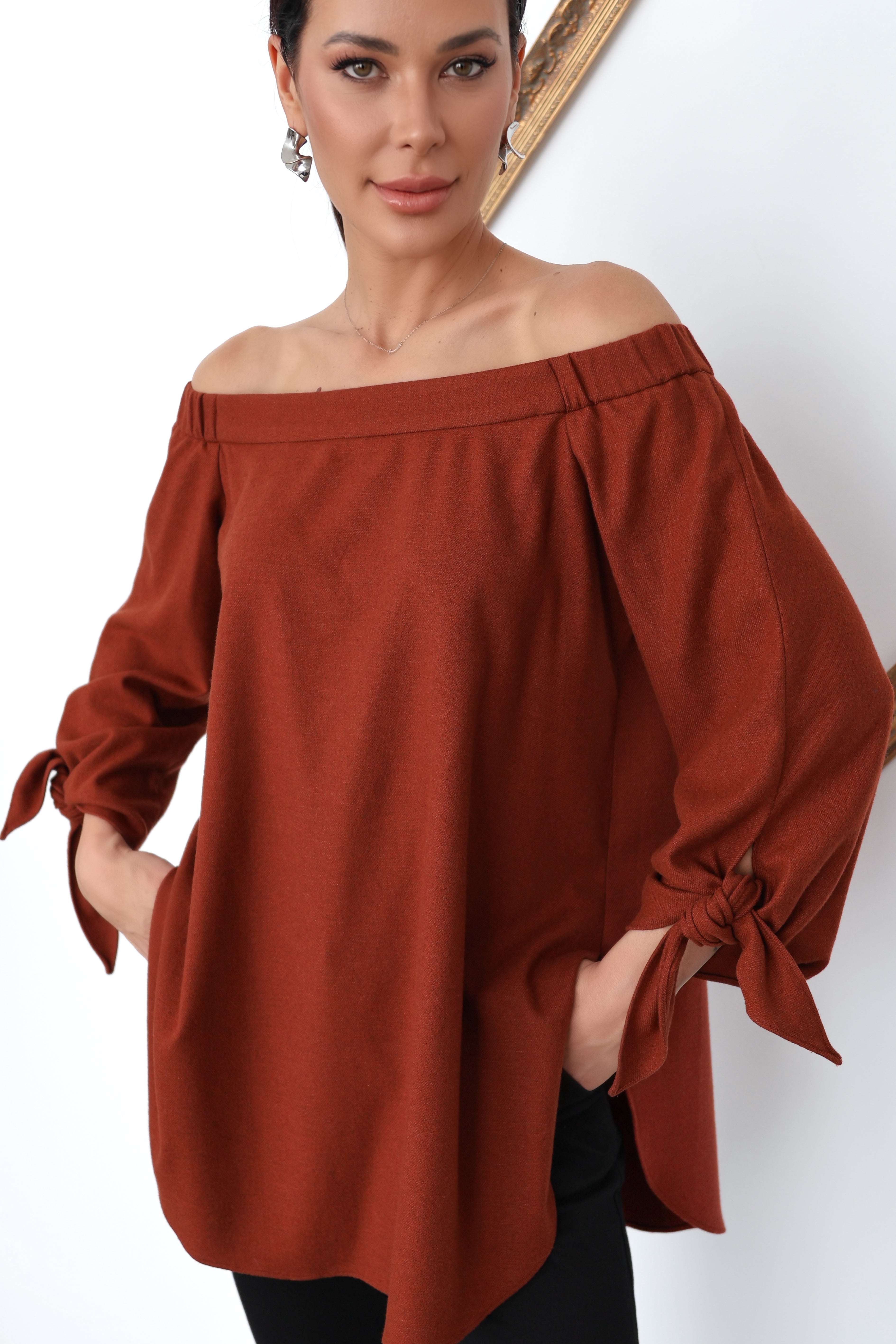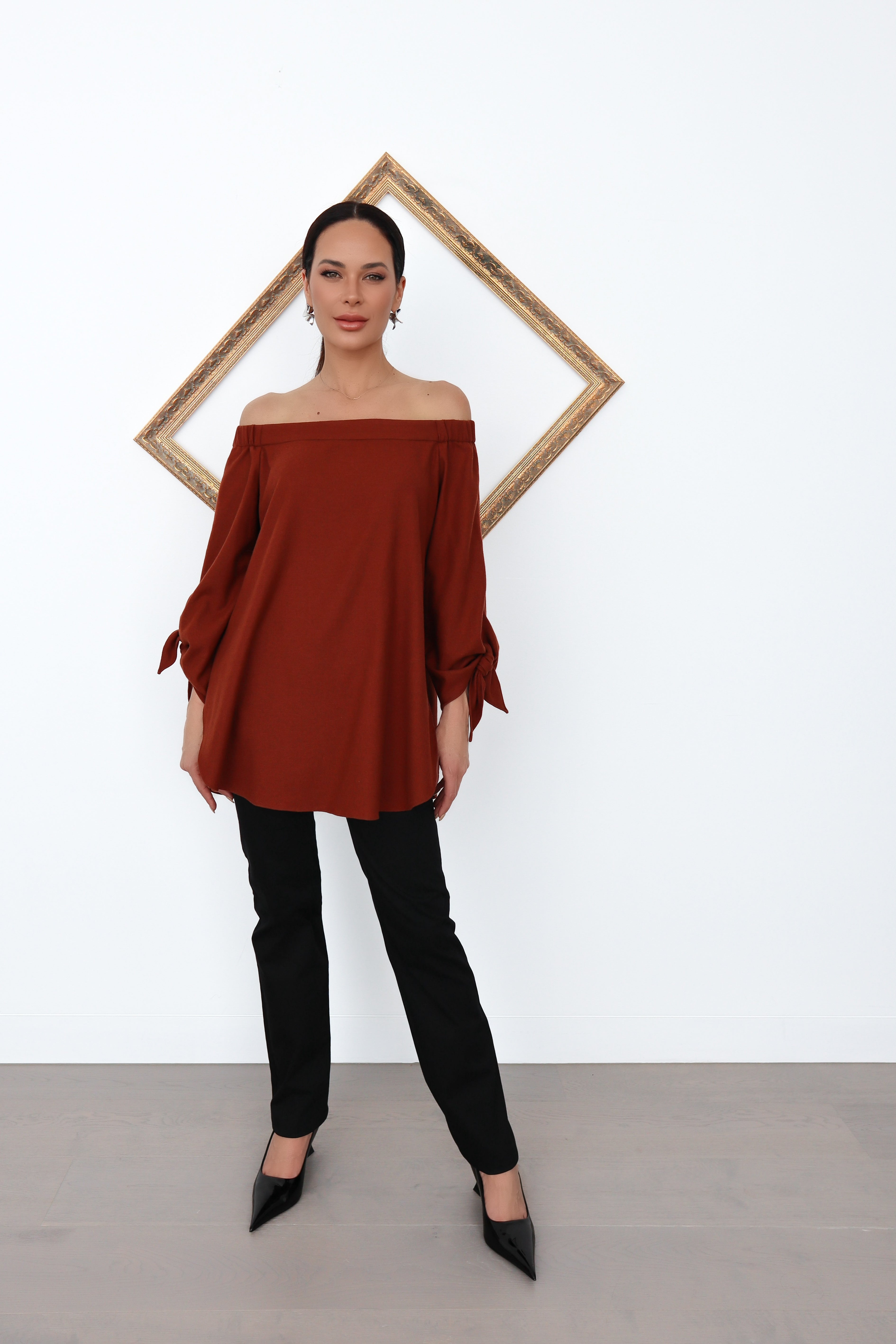 A chic and effortless Tibi classic, this off-the-shoulder Bateau blouse brings modern ease with a subtly dramatic silhouette. Crafted in a warm rust-brown tone, the top features an elegant straight neckline, relaxed drape, and softly voluminous three-quarter sleeves finished with feminine tie details.