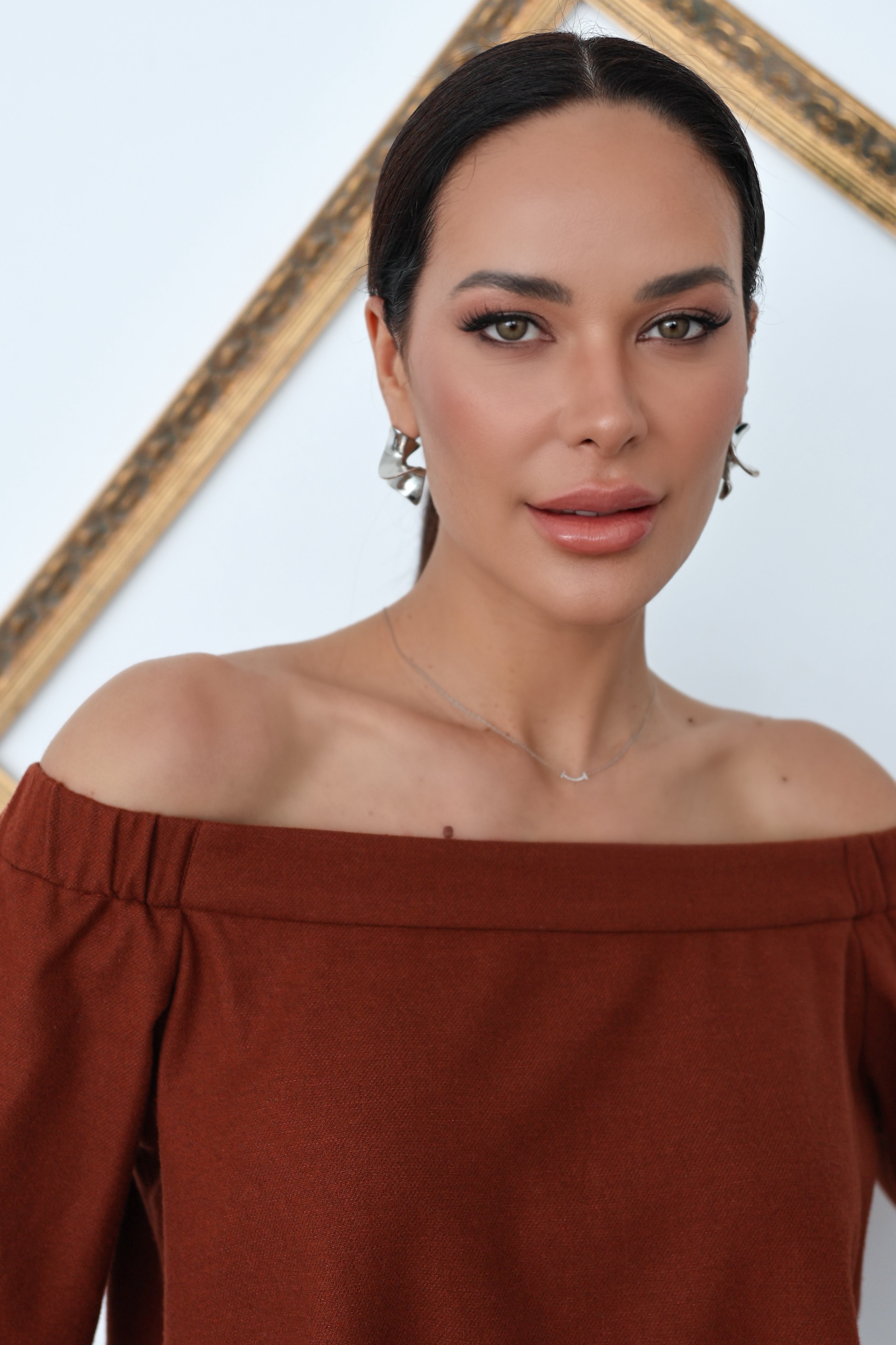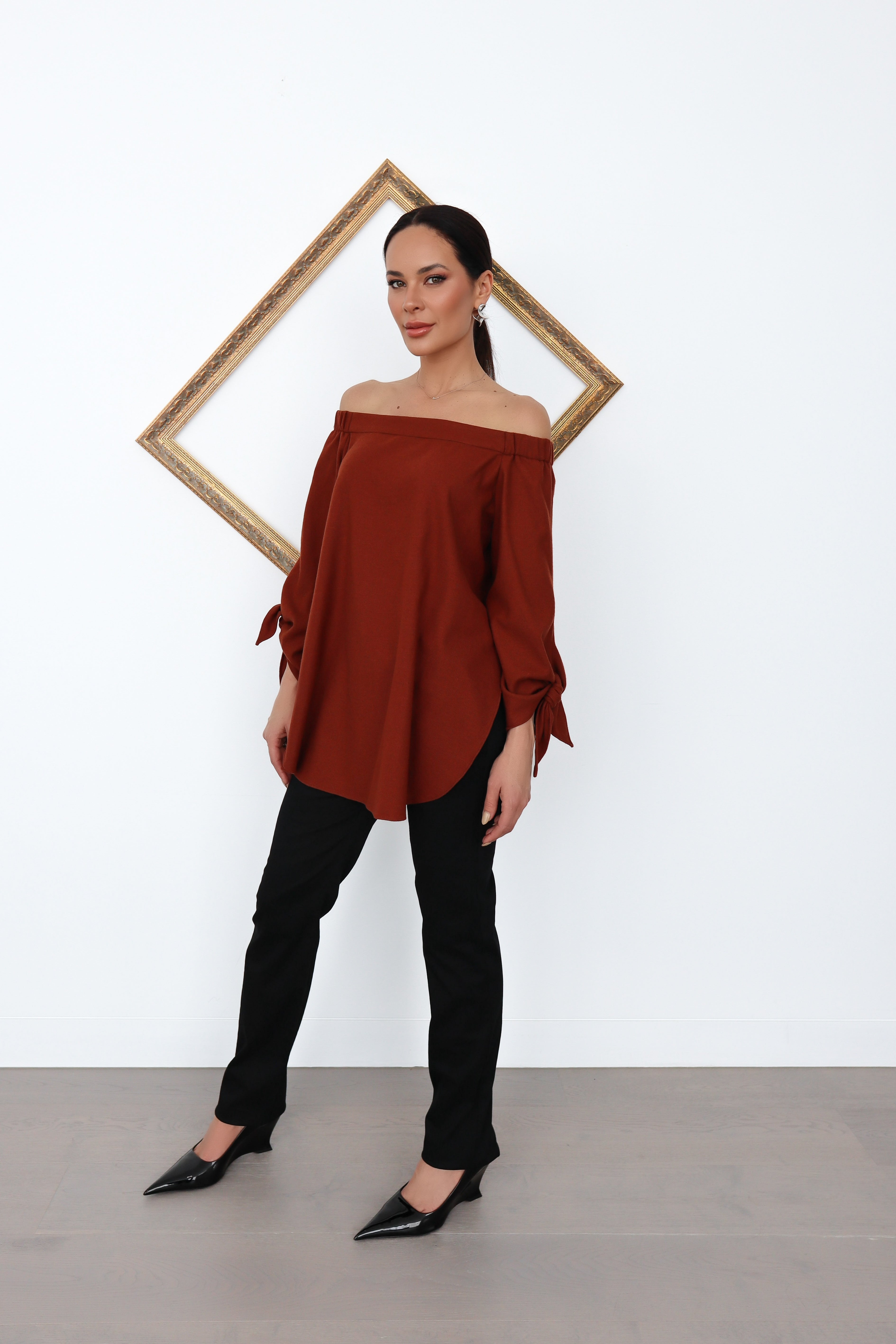 The cut is fluid, flattering, and designed to move beautifully, the kind of piece that instantly elevates black trousers, denim, or tailoring.Colour: Rust brown
