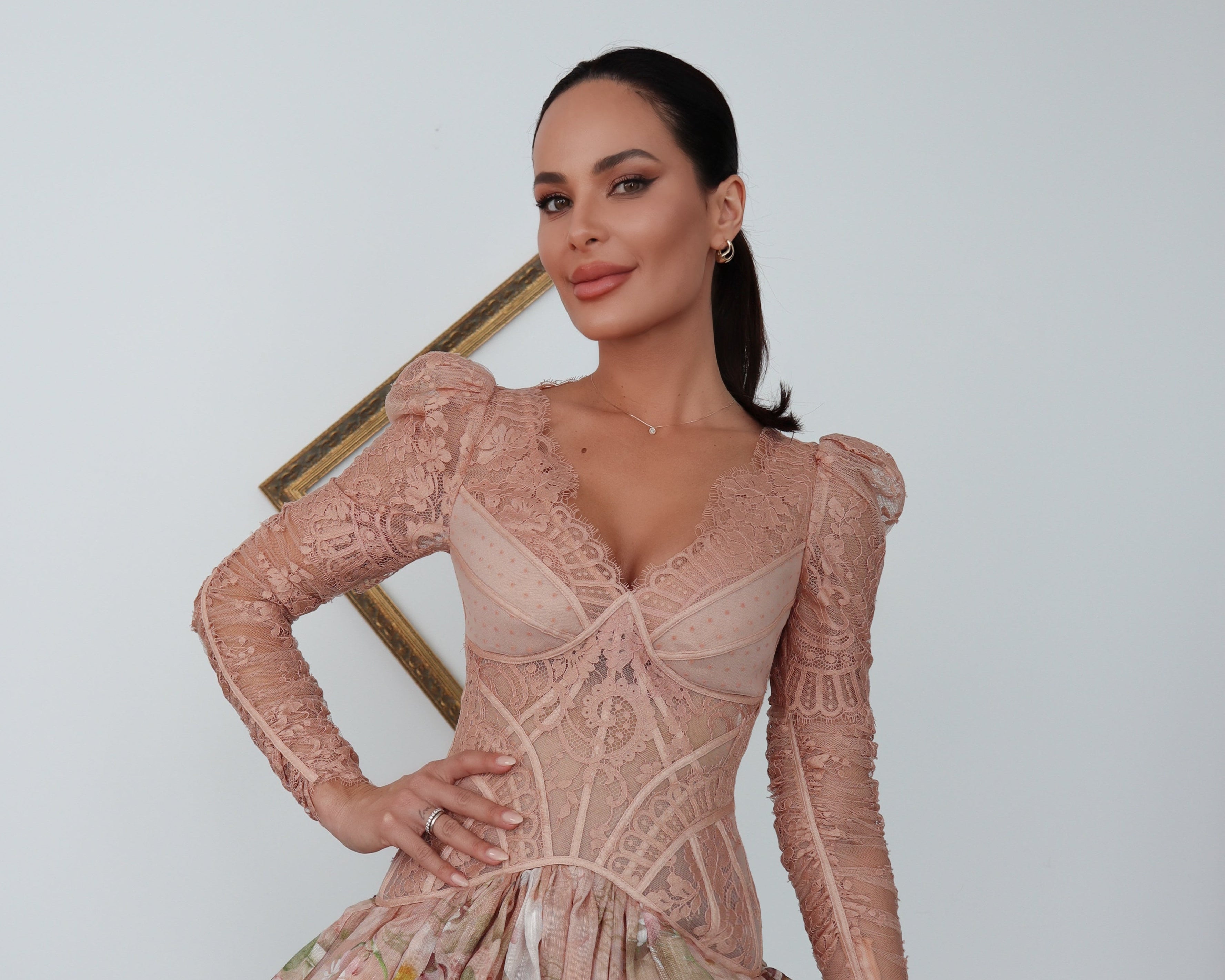 Featuring a fitted lace bodice with a V neckline and long sleeves, the upper silhouette is delicately structured to contour the body while showcasing intricate lace detailing.