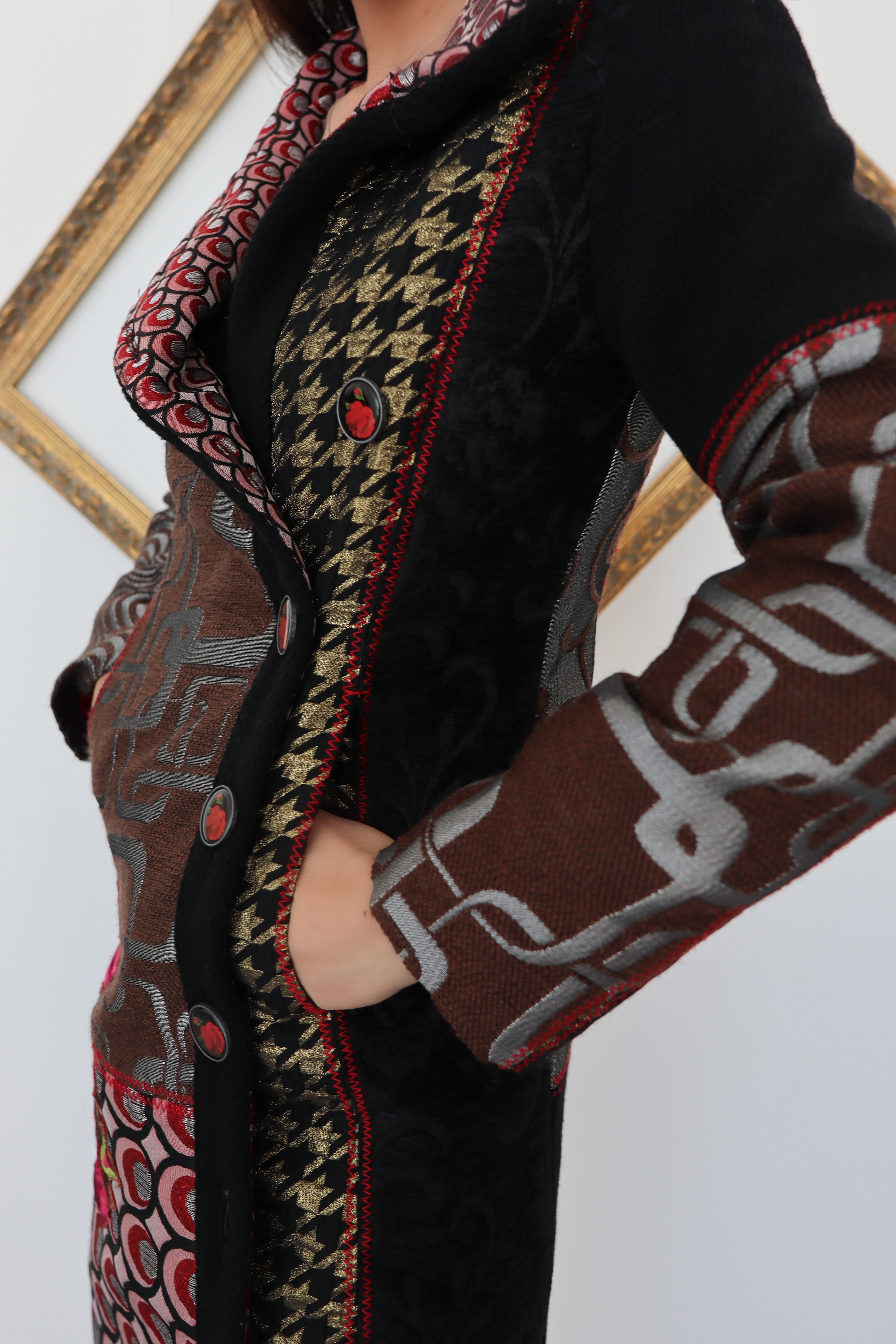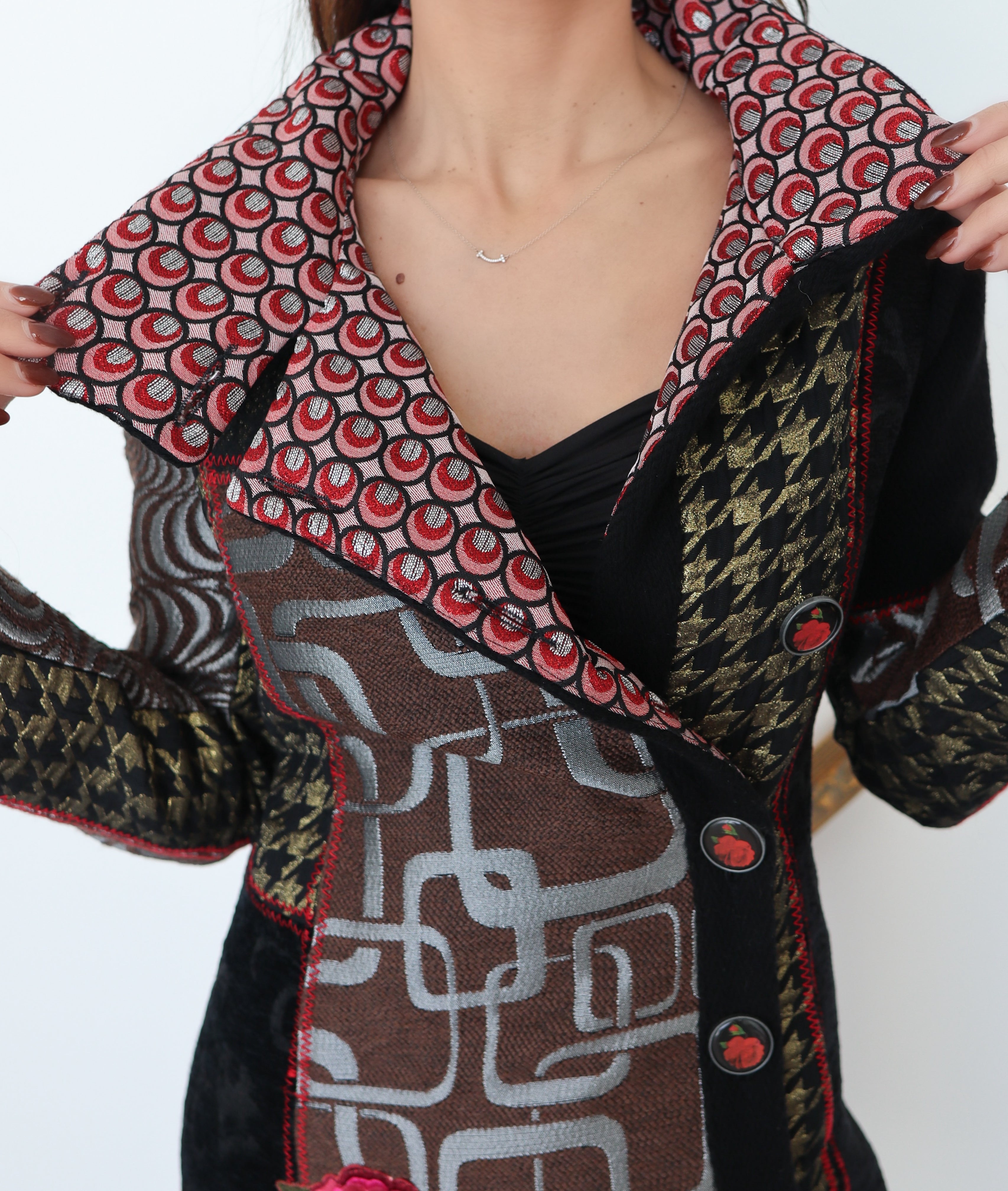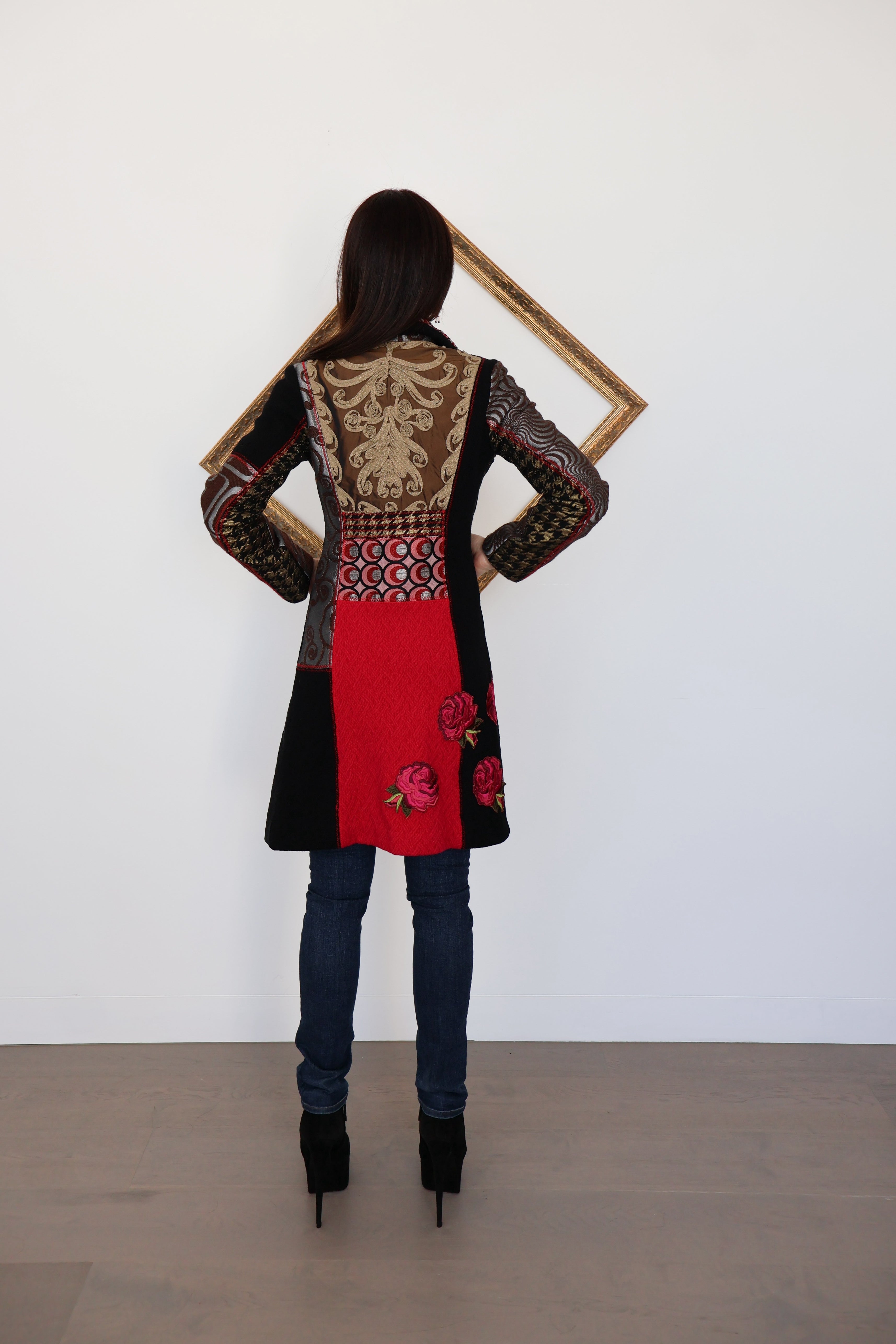 A signature Desigual statement coat crafted in the brand’s iconic patchwork aesthetic. This longline coat blends an eclectic mix of textures, prints, and embroidery, creating a wearable piece of art. The design features panels of geometric jacquards, abstract motifs, houndstooth, velvet-textured black sections, and bold red accents. Intricately embroidered red roses add a romantic flourish on the front and back, while contrasting sleeves and a sculptural lapel elevate the silhouette.
