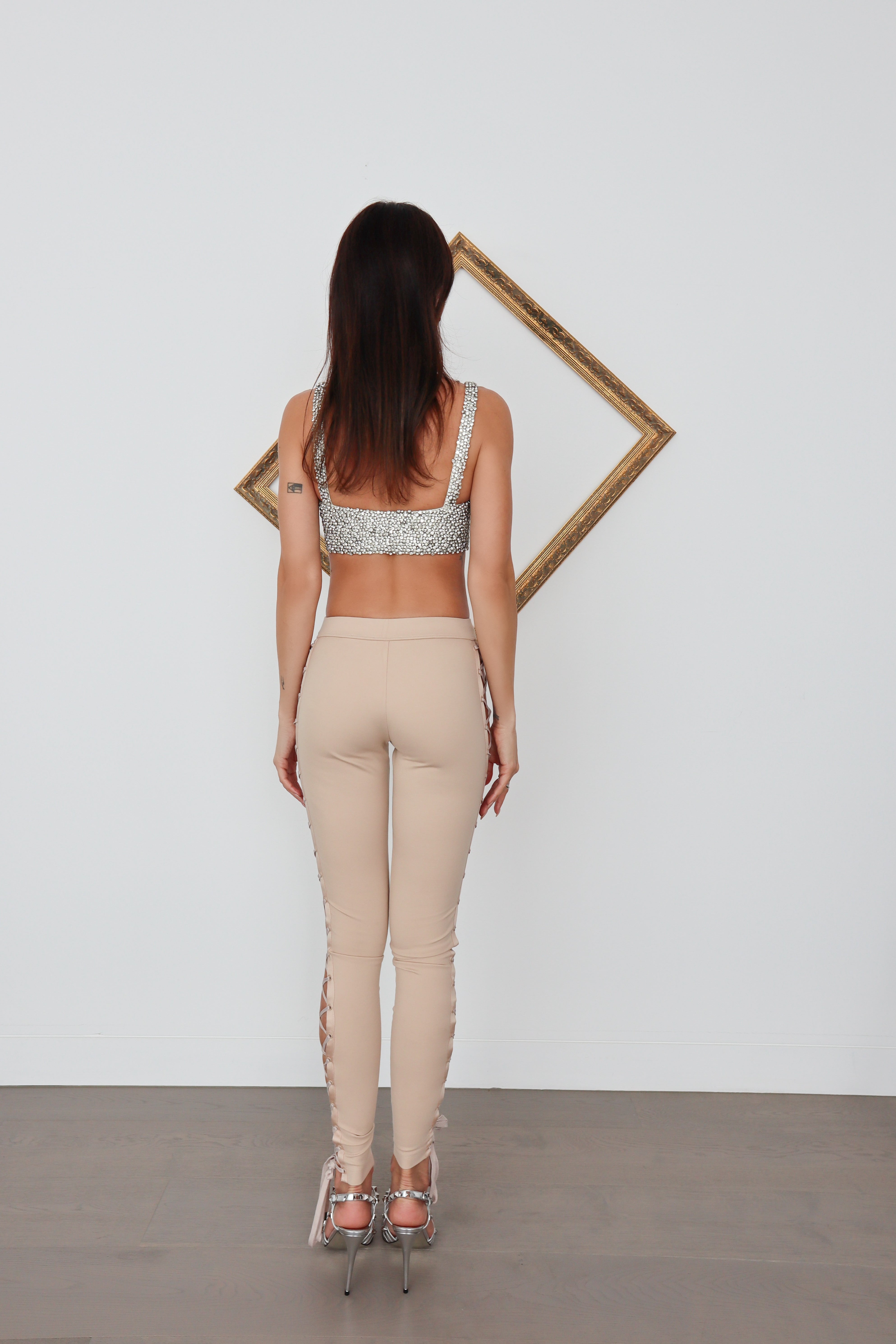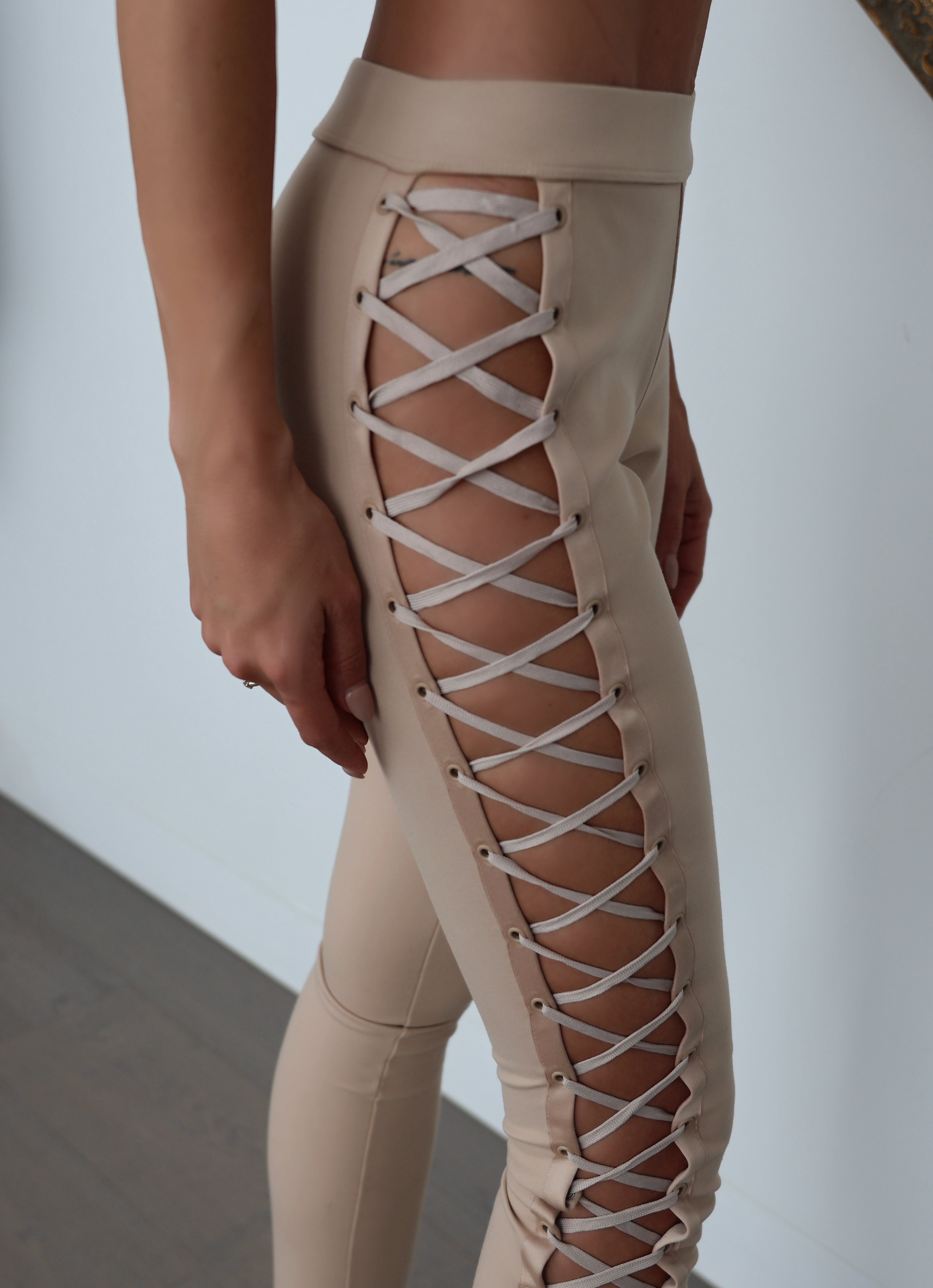 Designed in a versatile beige tone, the leggings feature distinctive lace-up detailing that elevates the classic tights silhouette into a statement piece.