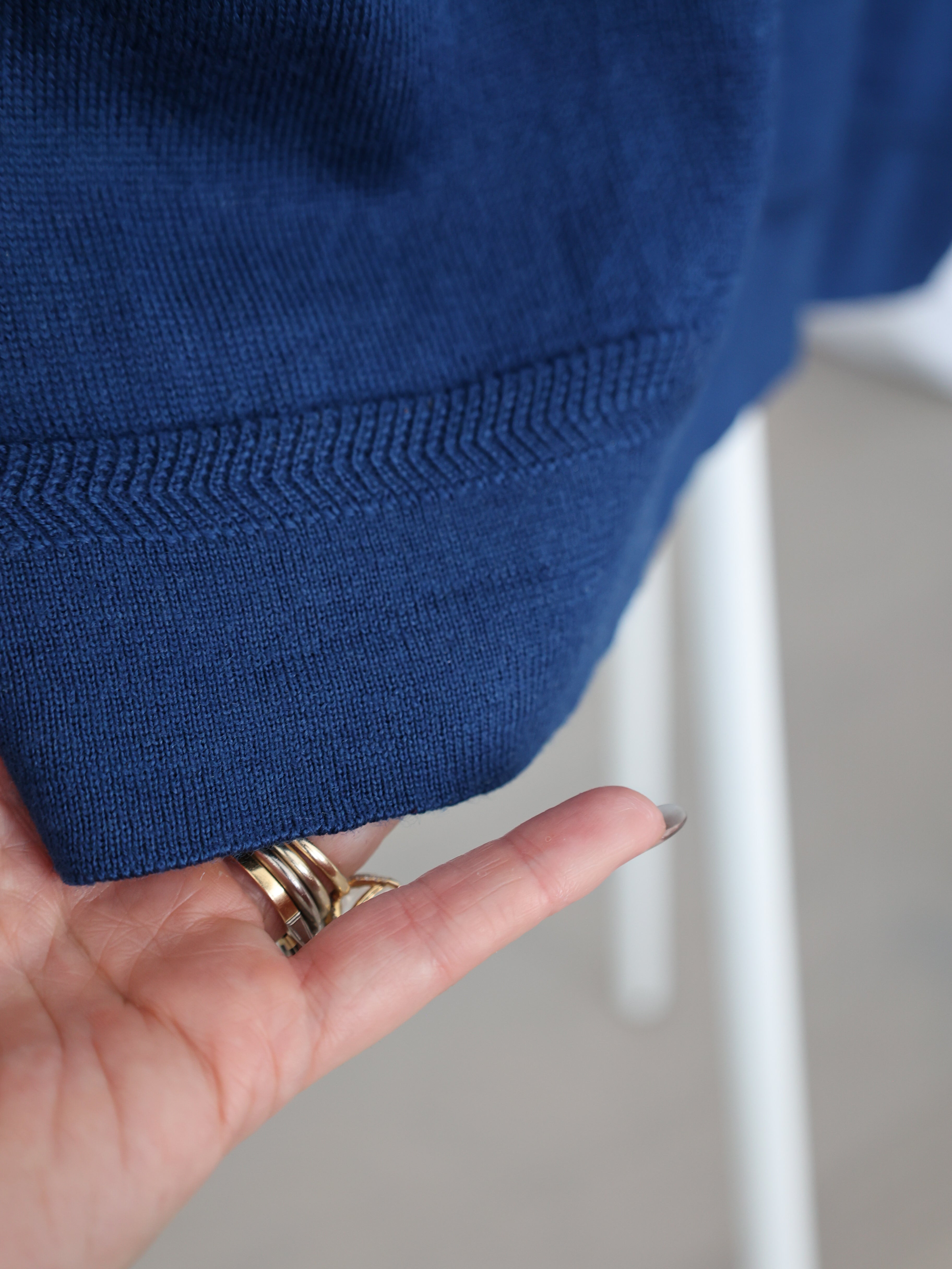 Crafted in a rich blue tone, the sweater features a clean silhouette with long sleeves and a classic V neckline, offering an elevated yet understated look.